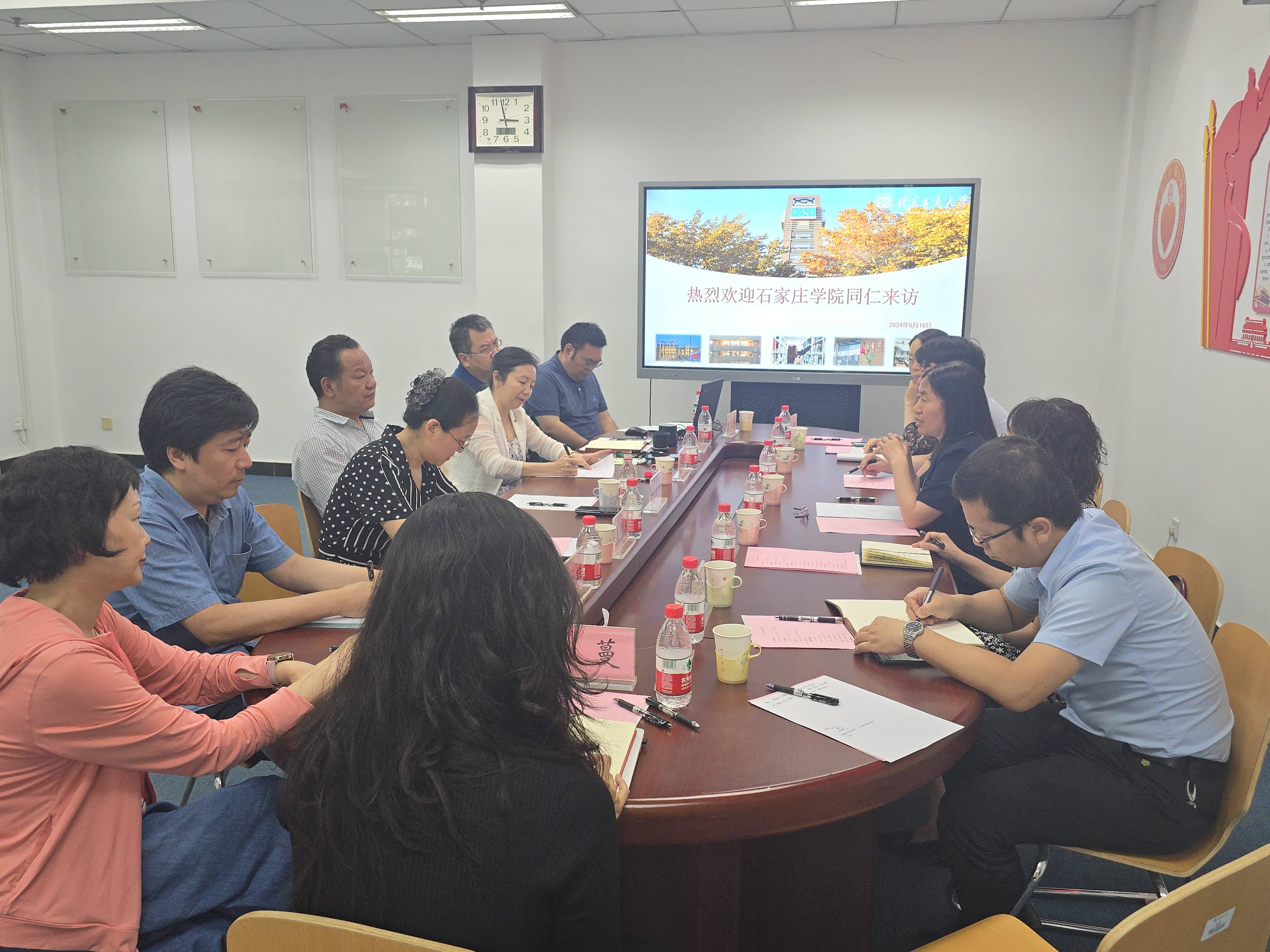 6月18日下午,李娟一行来到北京工商大学,北京工商大学党委常委、副校长郑文红热情接待了李娟一行。座谈会上,郑文红围绕理念转型、地方支持、人才培养、学科优势、未来发展等方面介绍了北京工商大学的办学举措与成效。他指出,正值京津冀协同发展十周年,希望同为地方高校的两校加强交流,立足地方,服务地方,进一步实现资源共享、深化教育合作。李娟详细介绍了我校的基本情况和学校“1396”发展战略。她表示,北京工商大学是教育部确立的首批教育信息化试点单位之一,多年来不断推进智慧校园新空间建设,于2023年成立了数字未来中心,为我校信息数字教育的创新理念转变和“数智校园”场景建设提供了可学习借鉴的成功经验。希望以此次交流为契机,搭建校际合作平台,探索联学联建模式,实现优质资源共建共享,助力学校一流应用型大学建设,共同描绘京津冀教育事业协同发展的美好图景。随后,两校相关部门围绕教育信息化背景下的高校图书情报工作、教学工作、信息化校园建设等方面开展了热烈的研讨交流。