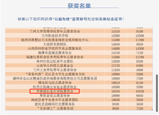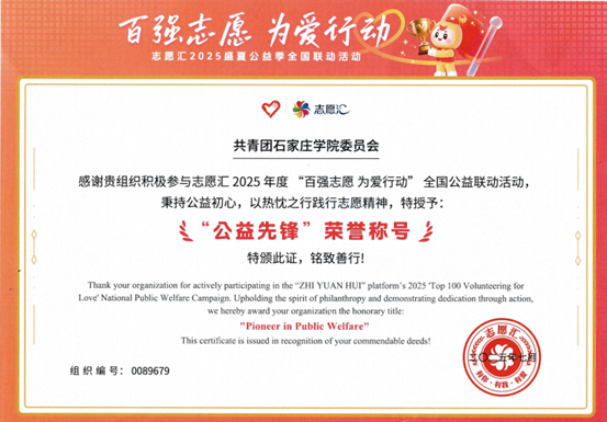 近日,在志愿汇平台发起的“百强志愿 为爱行动”2025盛夏公益季全国联合活动中,校团委从全国1507家参评组织中脱颖而出,凭借其在志愿服务领域的卓越表现和广泛影响力,以全国总排名第37位、全国高校排名第11位的成绩荣获“公益先锋”称号,也是河北省唯一荣获此称号的高校。