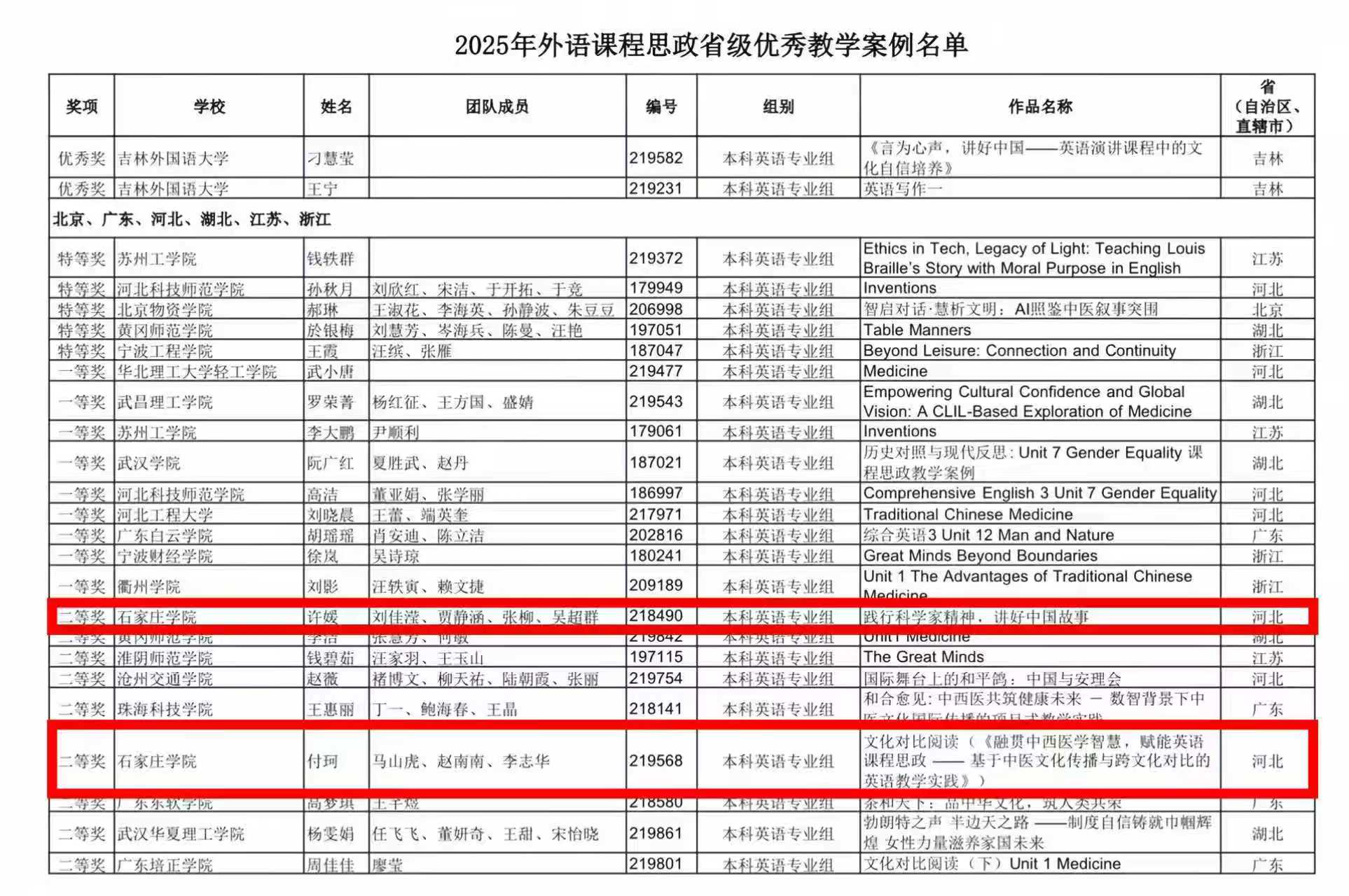 近日,2025年外语课程思政优秀教学案例征集与交流活动省级优秀案例名单正式公布。我校外国语学院许媛、付珂两位教师分别带领团队,在本科英语专业组评选中表现突出,均荣获省级二等奖,展现了我校在外语课程思政建设方面的扎实功底与创新实践。