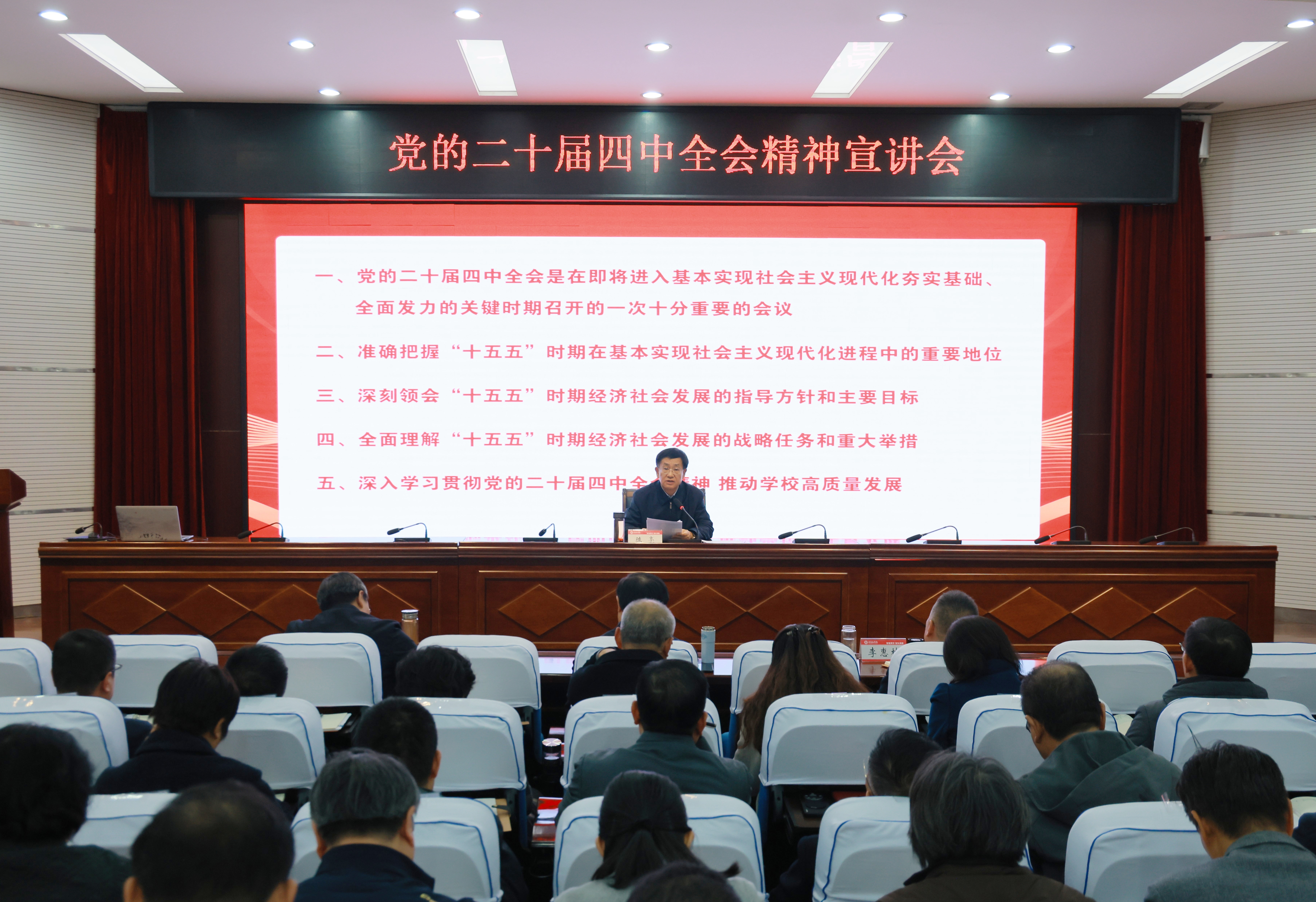 11月26日,党委书记陈亮在第二报告厅宣讲党的二十届四中全会精神。校领导祭立怀、冯宝强、李惠林出席,全体中层干部、全体党支部书记、教师代表、学生代表200余人参加宣讲会。