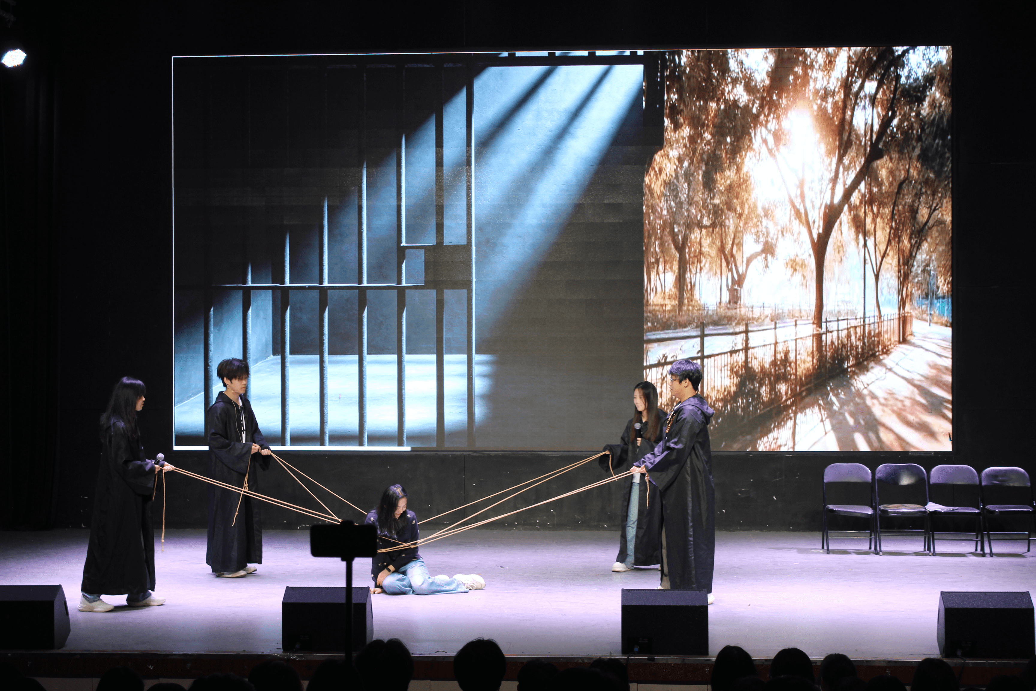 比赛现场光影交错,掌声此起彼伏。各参赛队伍以精湛的演绎,为观众呈现了一场兼具艺术感染力与心理深度的心灵盛宴。《不做傀儡老己》讲述了大学生磊小弟因沉溺于AI代写作业、代聊感情、代做抉择,逐步沦为科技“傀儡”,在作弊被抓、恋情告吹后,于醉梦中窥见前世因贪图安逸而被权臣把持朝政、终致悲剧的命运,最终幡然醒悟,蜕变为AI研发者,用行动诠释“人应当成为科技的主人,而非任人摆布的傀儡”。《沉默的雷鸣》聚焦迷茫的研究生林晓,在于敏先生隐姓埋名、带病攻坚的奉献精神感召下,他读懂沉默坚守即是国之重器,平凡科研亦为新时代的报国雷鸣,进而领悟到每一次专注钻研,都是在为家国未来积蓄无声而磅礴的力量。《与压同行》展现了学子在多重压力中挣扎,最终远赴新疆,在基层实践中将压力淬炼为动力,将“小我”融入祖国发展,与自我、与压力达成和解。《与自我和解》将焦虑、畏难、社恐拟作内心的“小怪兽”,刻画主人公在学业与赛场上的挣扎,幸得师长与同学的真诚帮扶,最终直面心魔,拥抱不完美却勇敢的自己,完成了温柔而坚定的蜕变。以上剧目主题鲜明、立意深远,在强烈的情感共鸣中,传递着理性平和、自尊自信、向上向善的积极心理态度。