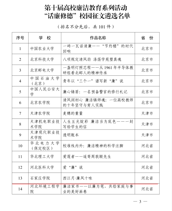 近日,教育部正式公布第十届高校廉洁教育系列活动评选结果,全国共遴选出“话廉修德”校园征文优秀作品101件,我校教师王子龙、檀怀远作品《西江月·廉风十咏》成功入选。