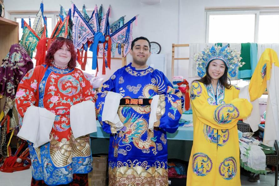 活动期间,研学团在我校的精心安排下,开启了一场融合艺术之美、文化之韵与时代之潮的研学之旅。校园之内,漫步海棠花海,参观写生书画展;舞台之上,昆曲《牡丹亭·寻梦》、留学生京剧联唱《锦绣梨园春》、奥克兰艺术学院合唱团《狮子王》《茉莉花》《天下一家》等经典歌曲同台绽放,以歌声跨越山海;国粹之间,体验京剧妆造与唱念做打,手绘美猴王面具;匠作之中,走进文创艺术馆,在陶泥中体验中国匠心,探索非遗技艺;剧院之内,聆听王唯旖「舍得」独唱音乐会,与演职人员深入交流,让音符成为两国青年心灵相通的桥梁。同时,研学团还走进教师教育学院,与中国学生共舞互赠,以音乐舞蹈搭建跨文化友谊;在美术高中开展书法研学,互赠友谊团扇。