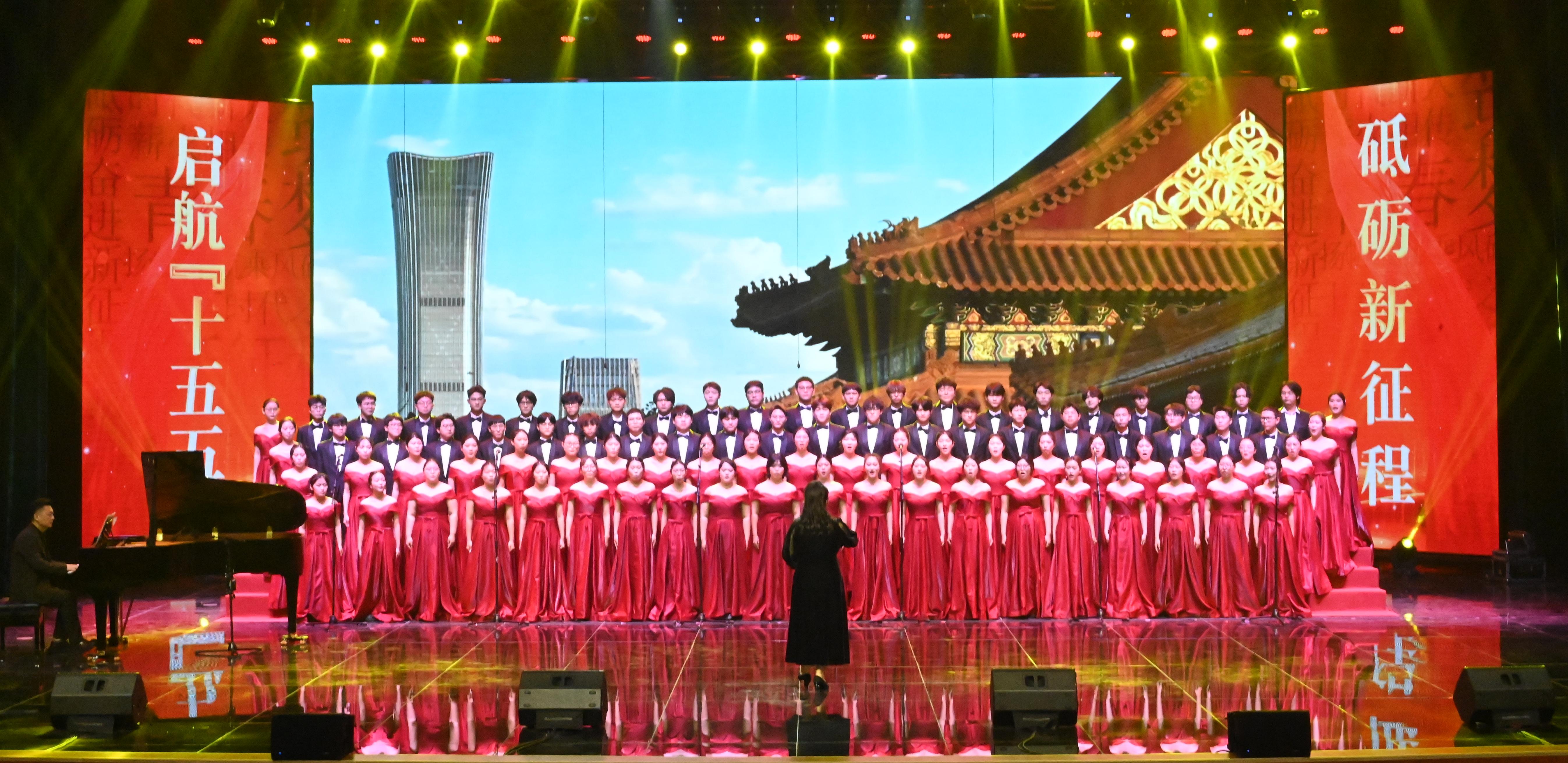 来自17个学院的参赛队伍依次登场,用嘹亮歌声唱响时代强音。乐达国际艺术学院《爱永在》、机电学院《保卫黄河》、未来信息技术学院《灯火里的中国》、教师教育学院《幸福的水花》、法学与社会学院《我的深情为你守候》、理学院/物理学院《我们都是追梦人》、地理科学与环境学院《追寻》、农业与食品科学系《众人划桨开大船》、体育学院《四渡赤水出奇兵》、外国语学院《中国之梦》、新闻与传媒学院《唱支山歌给党听》、文学与历史学院《新的天地》、马克思主义学院《当那一天来临》、经济管理学院《走向复兴》、化工学院/生物医药学院《美丽中国》、美术与设计学院《丰收的节日》、音乐学院《祖国不会忘记》等曲目轮番上演。学子们以深情旋律抒发爱国情怀,以昂扬姿态展现青春风采,为现场呈现了一场精彩纷呈的视听盛宴。