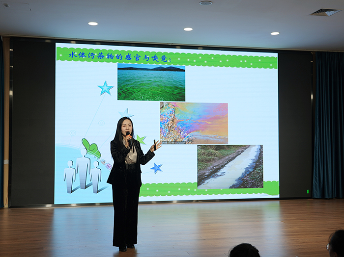 活动以“环保课堂进校园,‘童’心协力护环境”为主题,由我校地理科学与环境学院梁晶晶副教授主讲。梁晶晶围绕“常见的环境污染、如何鉴定水污染、如何测量噪声污染”三大主题展开,讲解内容贴近生活实际,类比中医文化中的“望闻问切”生动形象地讲解了水污染的判别指标,又结合有趣的故事与真实案例剖析了噪声的深刻影响。随后,宣讲团学生成员张馨颖展示了水污染的测定实验,刘之涵组织了生态环境知识有奖问答与互动,同学们积极踊跃参与,现场气氛热烈。活动最后,梁晶晶老师介绍了我校生态文明宣讲团的基本情况,呼吁现场师生共同传播生态文明理念,为建设绿色美丽家园贡献力量。