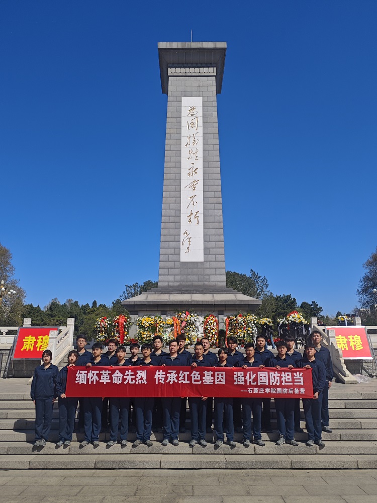 国防后备营师生一行20余人怀着崇敬之情来到华北军区烈士陵园。在庄严肃穆的“为国牺牲,永垂不朽"纪念碑前,全体师生整齐列队,神情肃穆,举行庄严的祭扫仪式。全体成员肃立,奏唱《中华人民共和国国歌》。国防后备营代表在纪念碑前向烈士敬献花束,脱帽致敬。