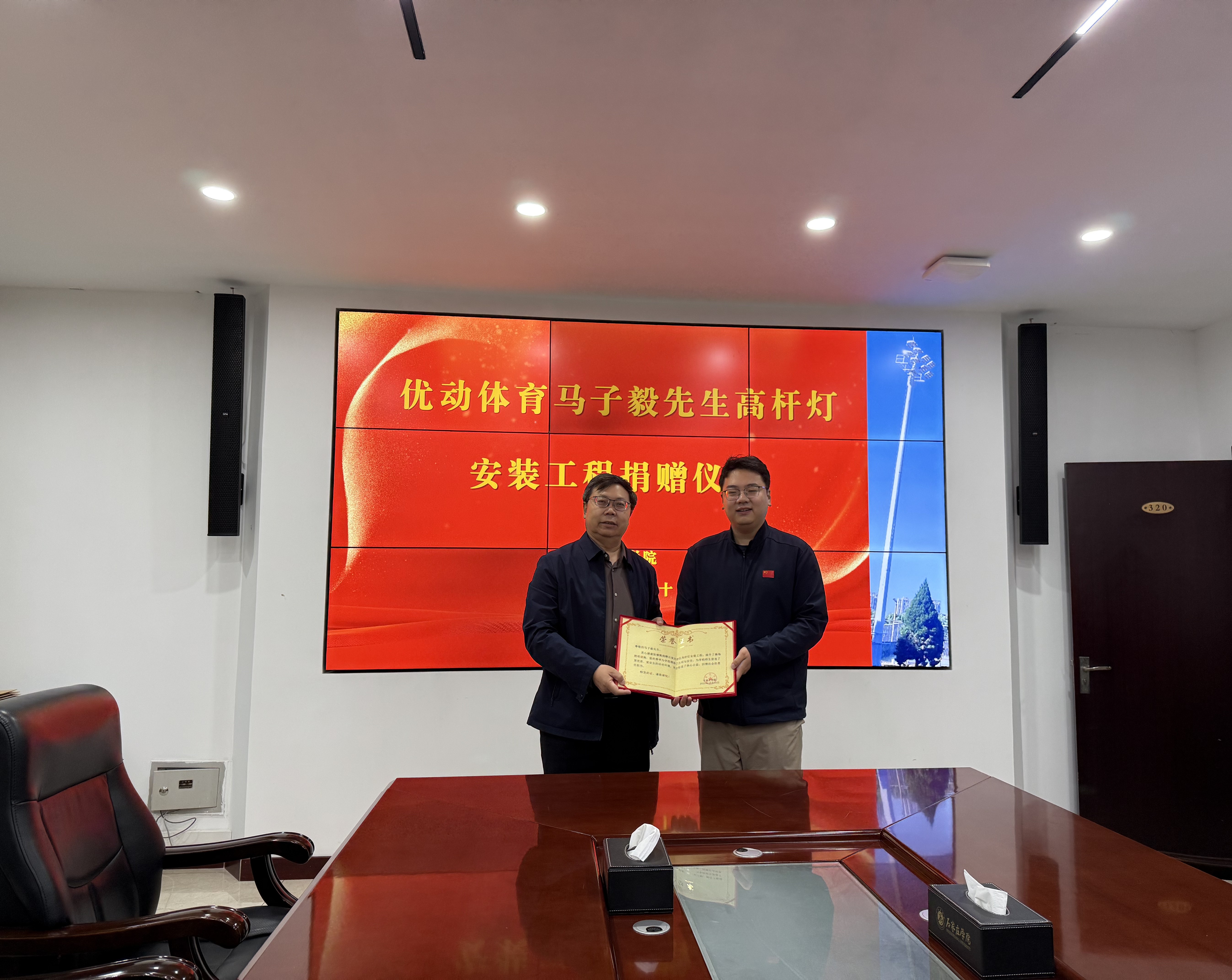 10月10日下午,我校在南校区行政楼第三会议室举行了“优动体育马子毅先生高杆灯安装工程捐赠仪式”。副校长冯宝强出席,学校办公室、统战部、学生处、后勤管理处及体育学院相关负责人参加捐赠仪式。