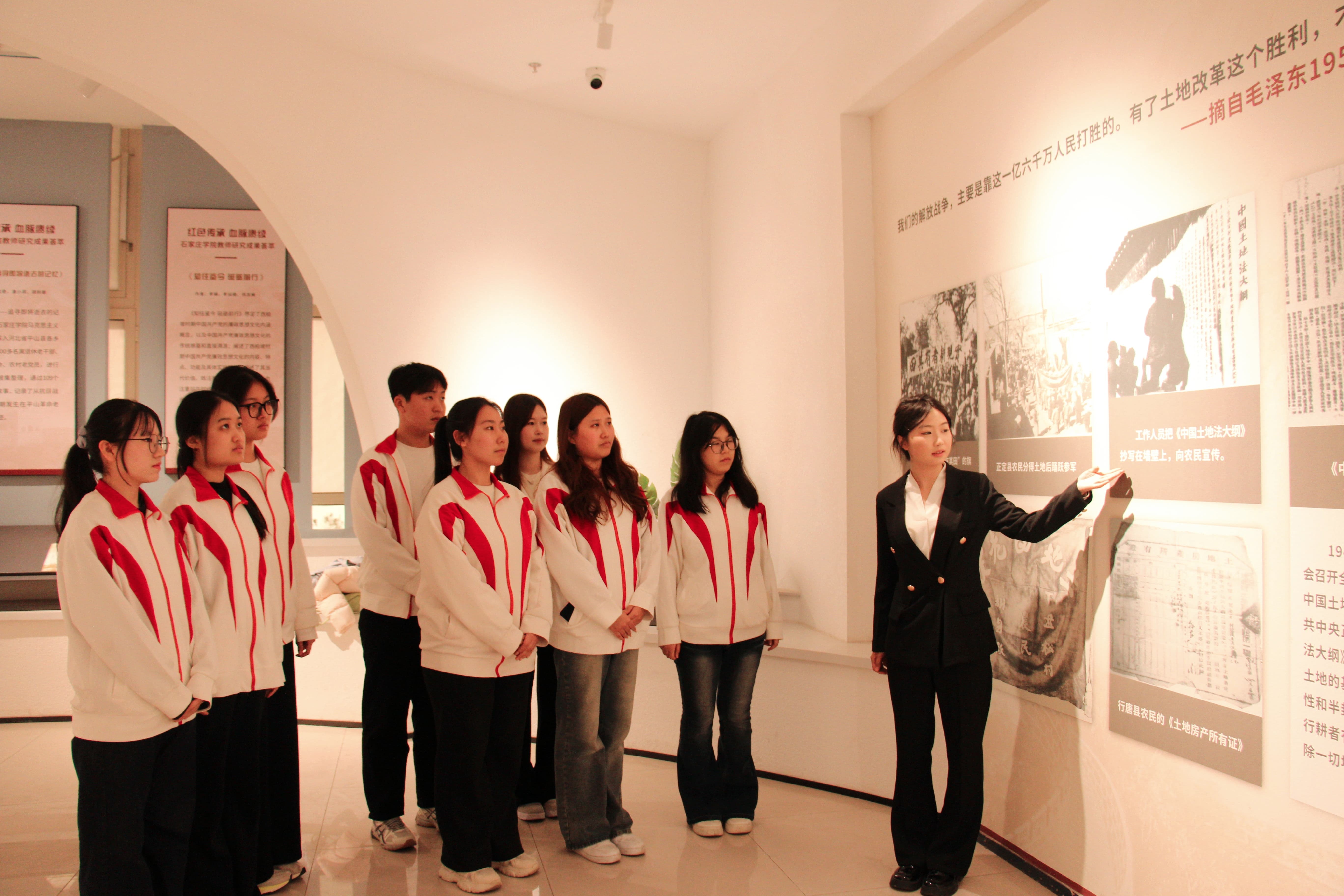 活动伊始,同学们在讲解员带领下走进石家庄地域文化馆。馆内的石家庄发展时间轴,清晰展现了这座城市从古至今的历史脉络。沿着时间轴前行,同学们来到西柏坡展厅,这里集中展示了西柏坡时期的历史文献、革命文物和影像资料。通过现场讲解,同学们深入了解了党中央在西柏坡时期的峥嵘岁月,感受“两个务必”的深刻内涵和“赶考”精神的时代价值。