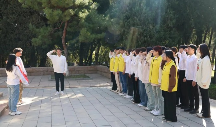 The University Youth League Committee and Student Union organized major student cadres to study the Patriotic Education Law of the People's Republic of China seriously, and went to the Martyrs Cemetery of the North China Military Region to carry out themed education.The students presented flowers to the Revolutionary Martyrs Memorial and solemnly swore and reviewed their oath of joining the Communist Youth League in front of the monument.