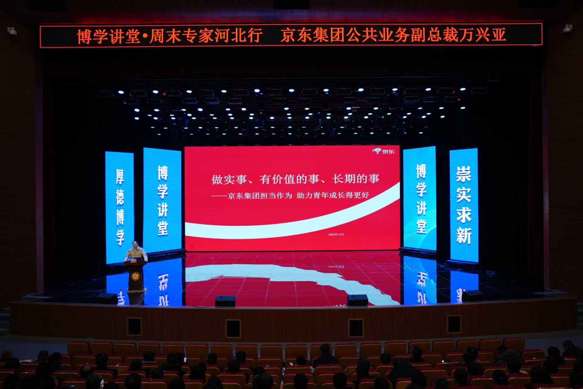 On the afternoon of December 30, our university held the Erudition Forum and the special activity "Weekend Experts Tour in Hebei". Mr. Wan Xingya, Vice President of Public Affairs of JD.com Group and General Manager of Hebei Government Affairs Coordination, was specially invited to deliver a keynote speech entitled "Do Practical, Valuable and Long-term Things". President Wang Yongqin, Vice Presidents Feng Baoqiang and Li Juan attended the event, which was also attended by nearly 1,000 participants including all middle-level cadres, teaching and research office directors, heads of scientific research platforms and key disciplines, as well as student representatives.