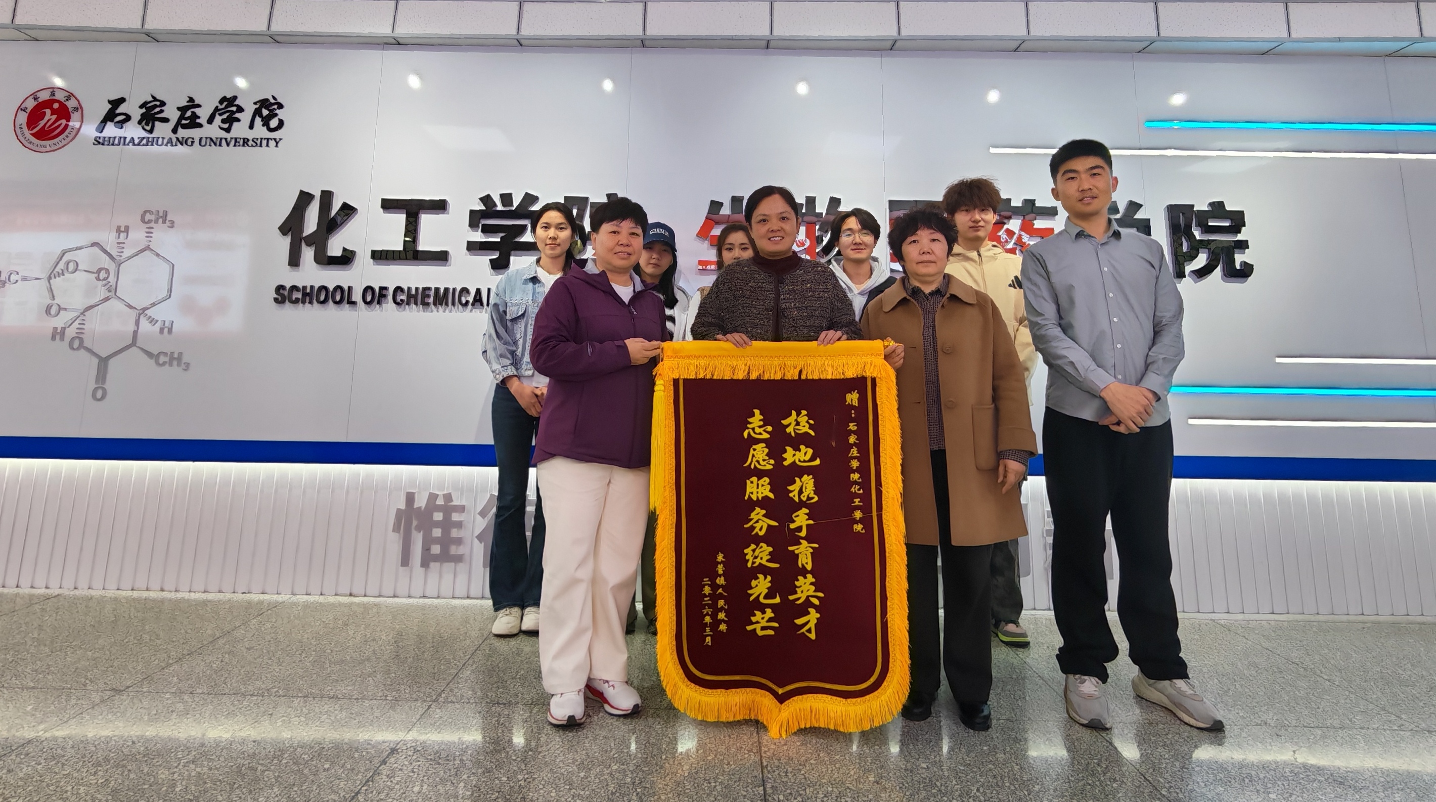 3月30日,石家庄高新区宋营镇副镇长、工会主席一行莅临我院,专程为我院在2026石家庄马拉松赛事中提供的志愿服务赠送锦旗,对我院师生倾力支持地方赛事、践行志愿精神的担当作为致以诚挚感谢。