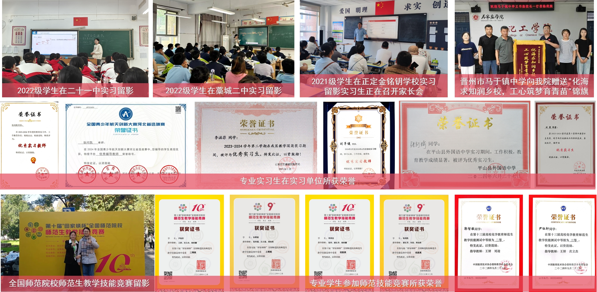 以学科教学(化学)研究基地为依托,专业与石家庄市及周边区县共建二十余处教育实践基地,涵盖人才培养过程的教育见习、教育实习、教育研习三个阶段。基地初、高中兼有,师资优良,管理规范,课程资源丰富,形成了多层次教学实践体系。学生实习期实行校内、校外双导师负责制,通过双方导师对教学设计、授课过程和教学研究等多方面的指导,为学生从师范生蜕变为卓越教师提供知识和能力支持。近三年,专业学生参加“田家炳杯”全国师范院校师范生教学技能竞赛荣获二等奖1项,三等奖1项,优秀奖2项,全国高校化学教育师范生教学技能大赛二等奖1项、三等奖1项,“京津冀蒙高校联盟师范分盟”第一届师范生教学技能大赛三等奖1项、优秀奖1项,学生教学技能日臻成熟。