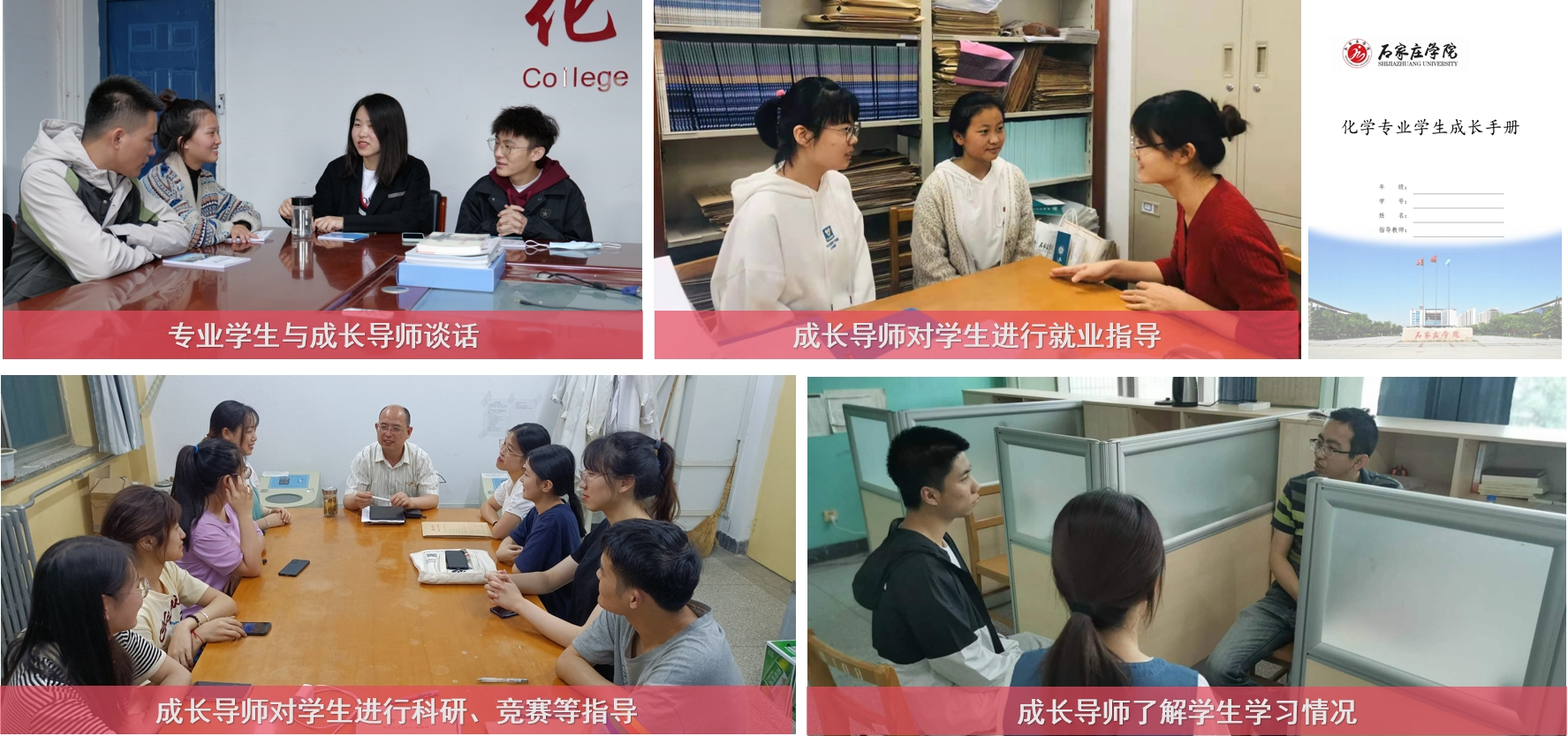 本科生导师制保障学生全面发展,导师不仅会在大学四年对学生进行个性化指导,在毕业后 5-10年仍会持续跟踪。专业编制了《石家庄学院化工学院大学生成长手册》,主要涵盖了大学四年的学习、生活规划,通过学生们记录大学生活,导师给出点评和建议,让学生更好的规划大学学习和生活。