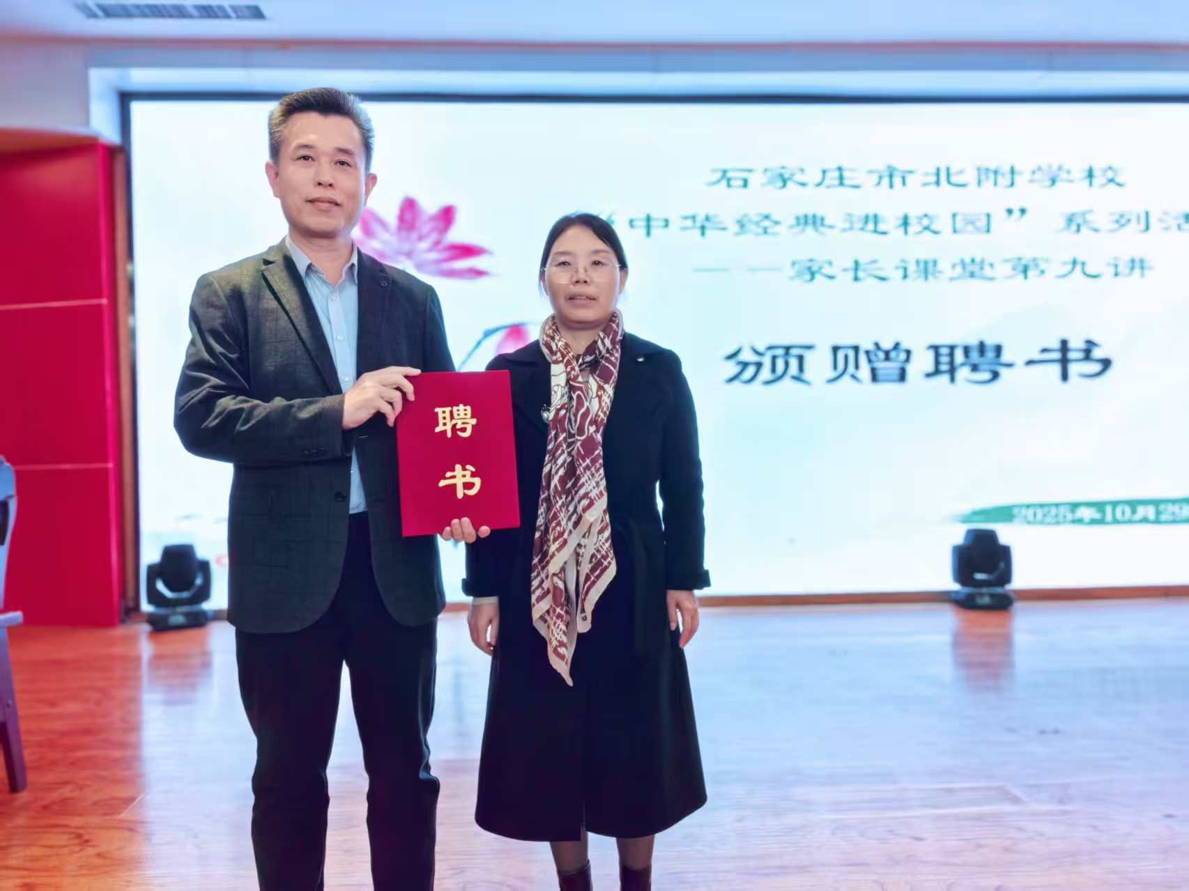 讲座结束,石家庄市北附学校校长韩志杰为霍贵高老师颁发家长课堂专家聘书。韩志杰校长指出,本次讲座为广大家长提供了基于传统文化智慧的家庭教育新视角,对促进学生全面成长、推动和谐家庭建设具有重要指导意义。与会家长普遍表示,讲座内容深入浅出,既有理论高度,又贴近现实,在理念与方法上均带来启发,令人受益匪浅。