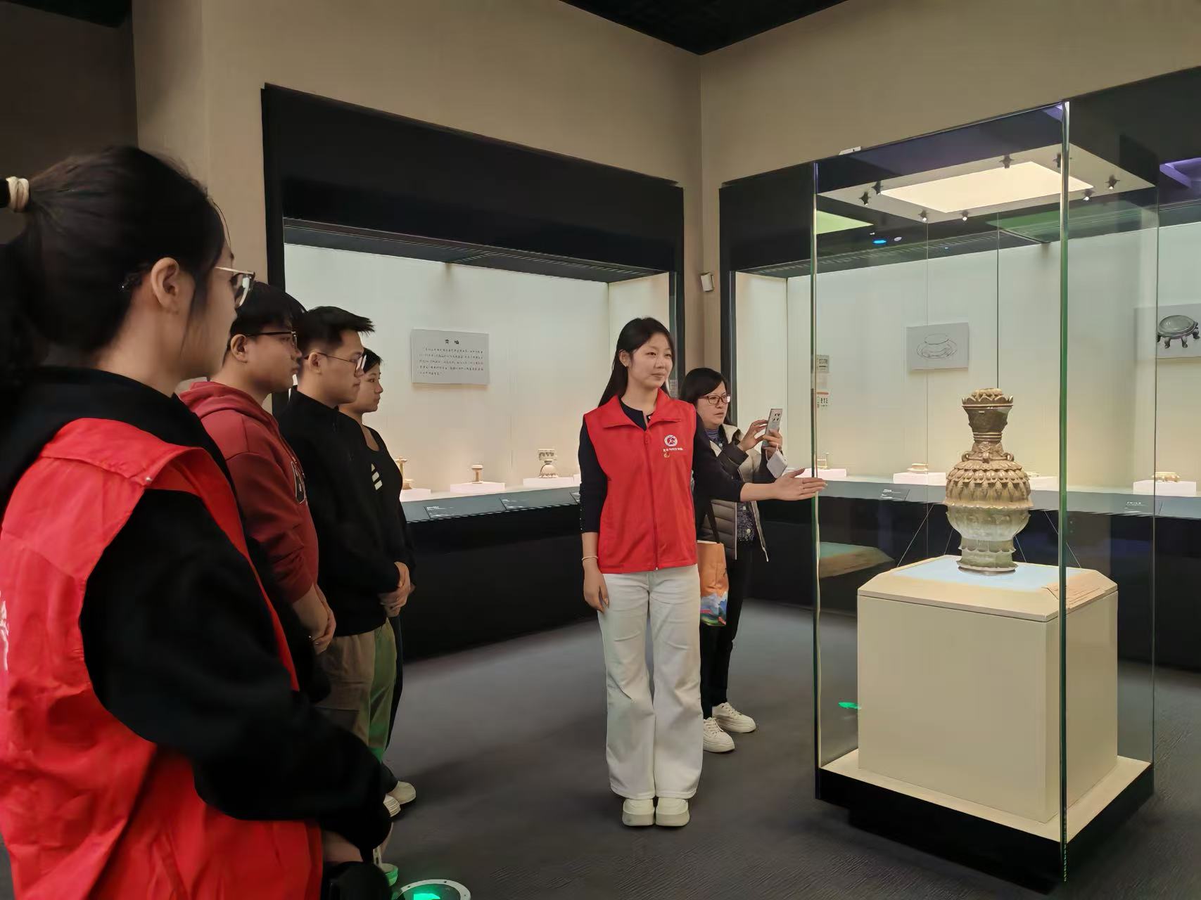 在北齐青釉仰覆莲花尊这件国之瑰宝前,入党积极分子代表化身现场讲解员,以文物为“活态教材”,娓娓道来其历史背景、工艺特色与文化内涵。他们更将古人智慧与新时代文化自信建设相连接,为这件千年珍宝赋予了鲜活的时代注解,让同学们在历史的纵深漫步中,深切筑牢了民族文化的认同与自豪。