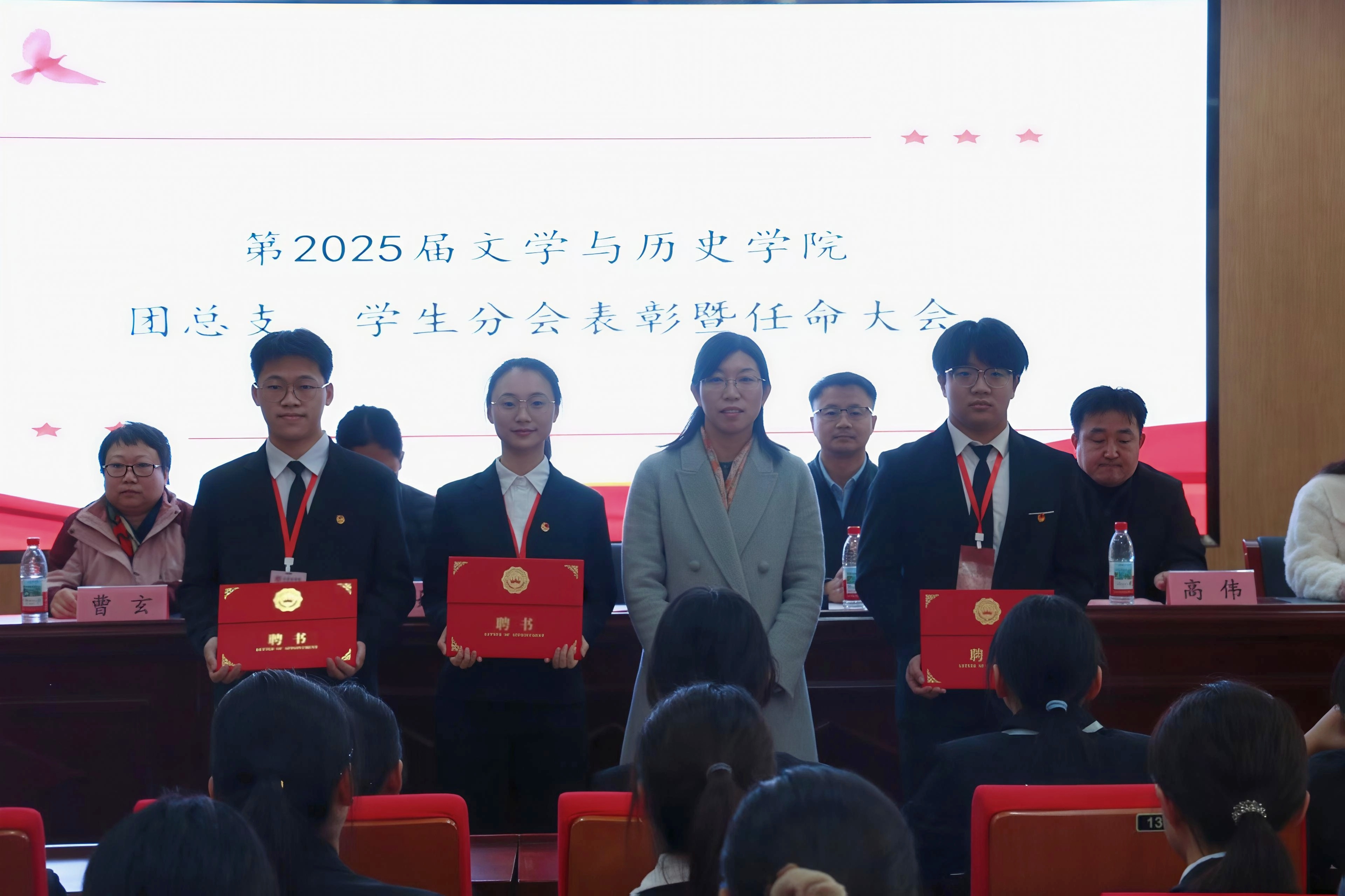 11月27日下午,文学与历史学院2025届学生干部表彰暨聘任大会在二楼东报告厅召开。文学与历史学院领导班子、团总支书记、学生党支部书记、辅导员、教师代表及学生会全体成员参加会议。