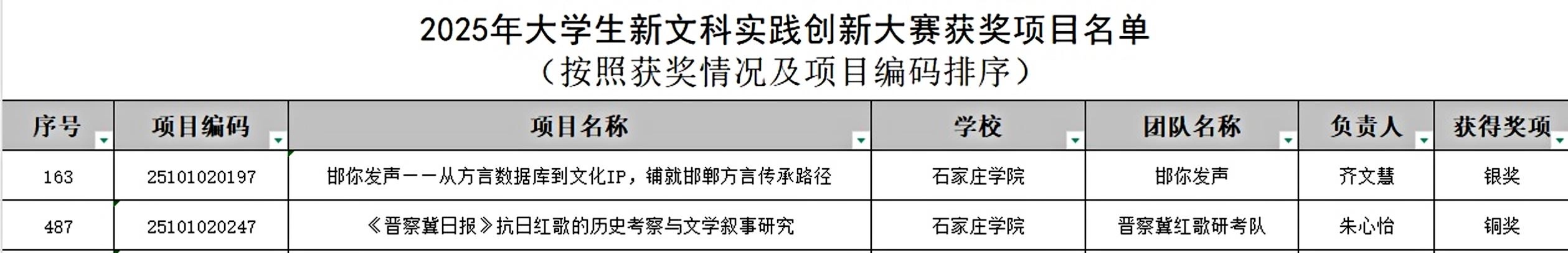 11月30日,2025年大学生新文科实践创新大赛全国总决赛在陕西西安顺利闭幕。本次大赛吸引了来自全国433所高校的广泛参与,共计超2.5万个项目报名参赛。我院学生申报的《邯你发声——从方言数据到文化IP,铺就邯郸方言传承路径》项目获国家级银奖;《<晋察冀日报>抗日红歌的历史考察与文学叙事研究》项目获国家级铜奖。