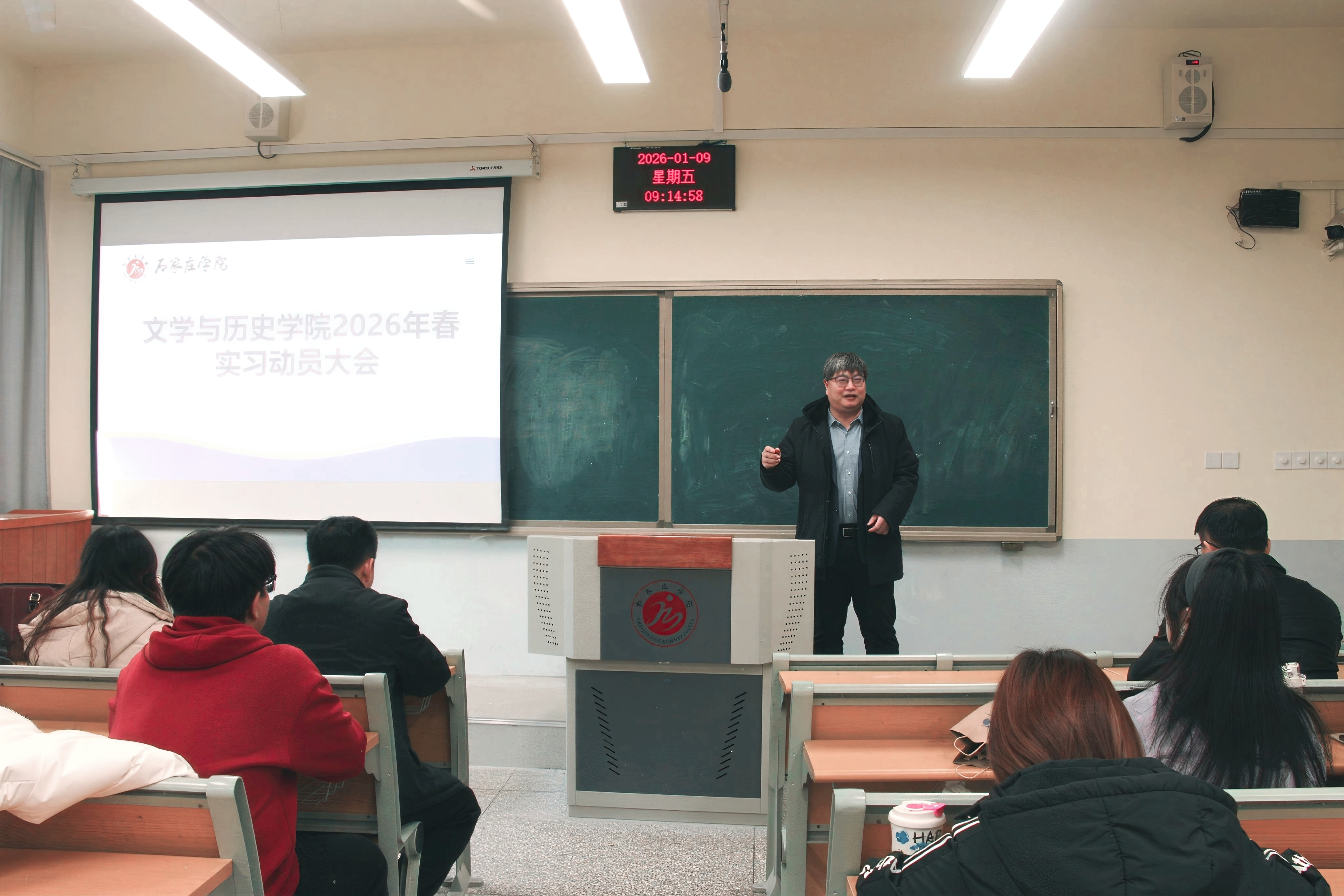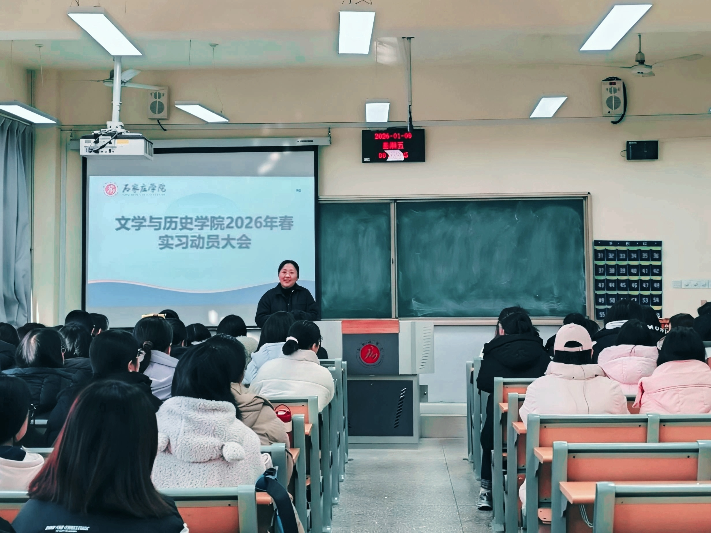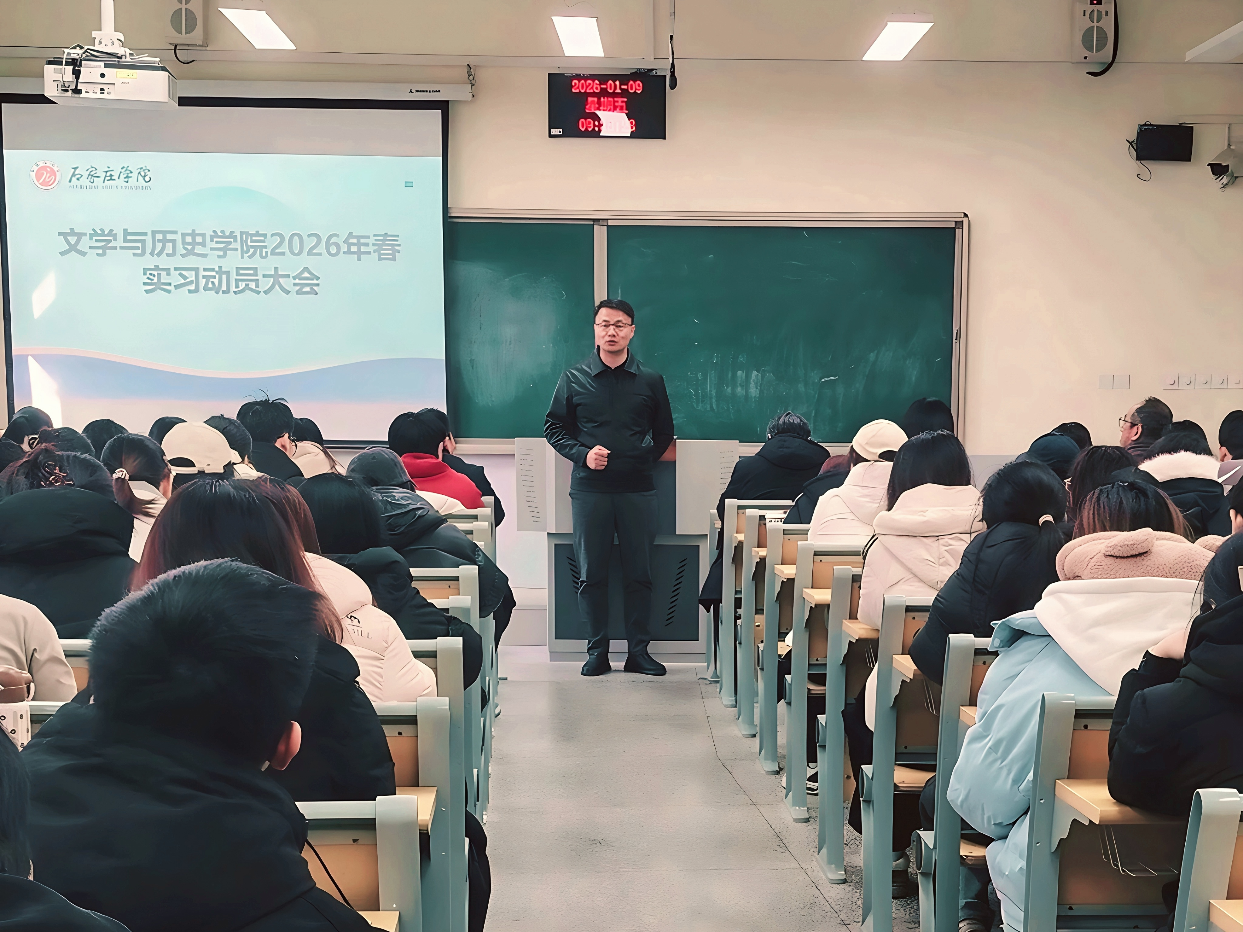 为扎实做好教育实习工作,引导学生明确实习目标与任务,1月9日上午,文学与历史学院组织召开2023级学生实习动员大会,共180名学生参加动员会。