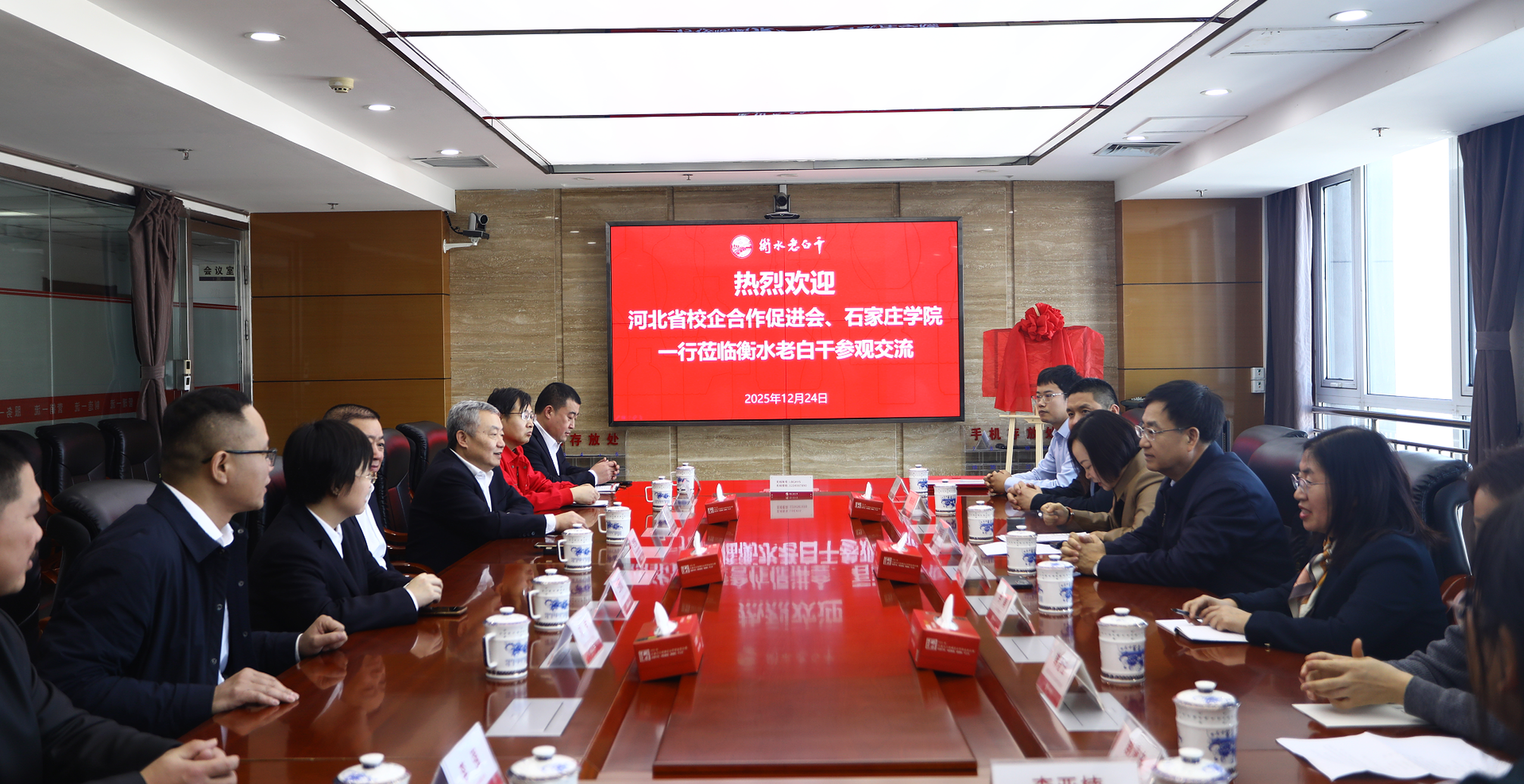 座谈会上,陈亮从我校师范教育起家,办学地址变迁,详细介绍了我校的发展概况、学科优势及人才培养特色。他表示,学校经过多年发展,已从单一师范教育转型为涵盖多学科的综合性大学,专业设置与石家庄五大千亿级产业集群高度匹配,与华为、腾讯等企业建立了合作关系,特别是在生物医药、电子信息、食品科学等领域具备专业优势。我校目前着重在学生综合素养提升、产教融合及校企合作上发力,汇聚了强劲的科研力量与人才资源。衡水老干白酒业作为行业龙头型企业,有着悠久的历史和先进的实践技术,希望双方以此次签订战略合作协议为契机,联合申报项目、引入企业导师、共建实训基地,培养出“毕业即就业、上岗即上手”的应用型人才,精准服务地方经济和企业转型升级的需求。