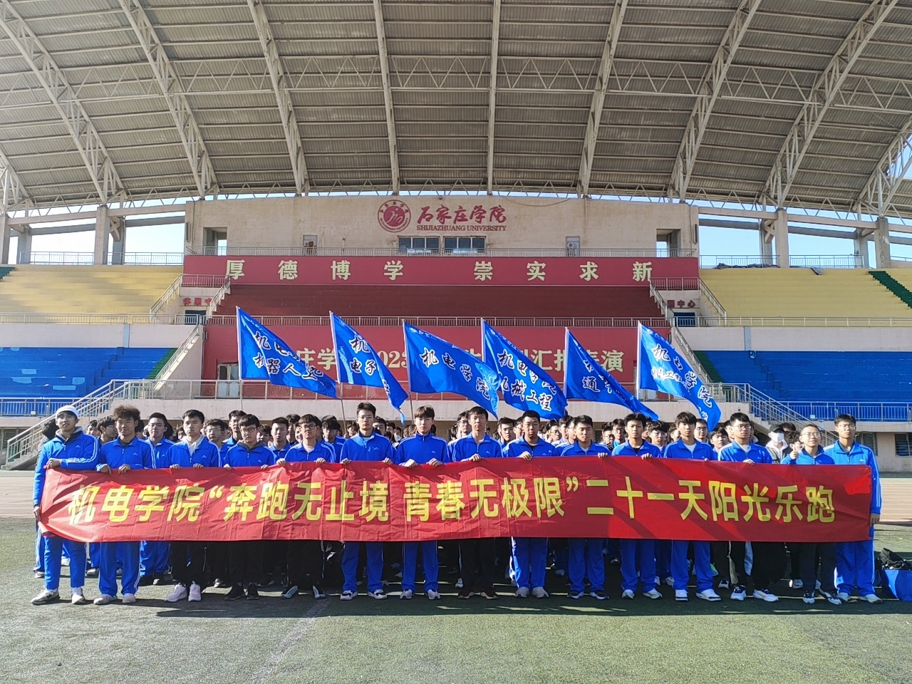 为深入落实我校“学生综合素养提升”工程,激发大学生参与体育锻炼热情,提高学生健康水平,11月24日,机电学院第一期“奔跑无止境 青春无极限”校园阳光乐跑21天打卡活动在南校区西操场启动。机电学院领导班子、辅导员、团学干部、学生代表200余人参加启动仪式。