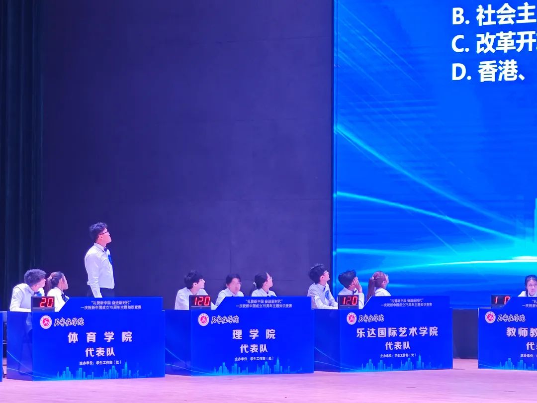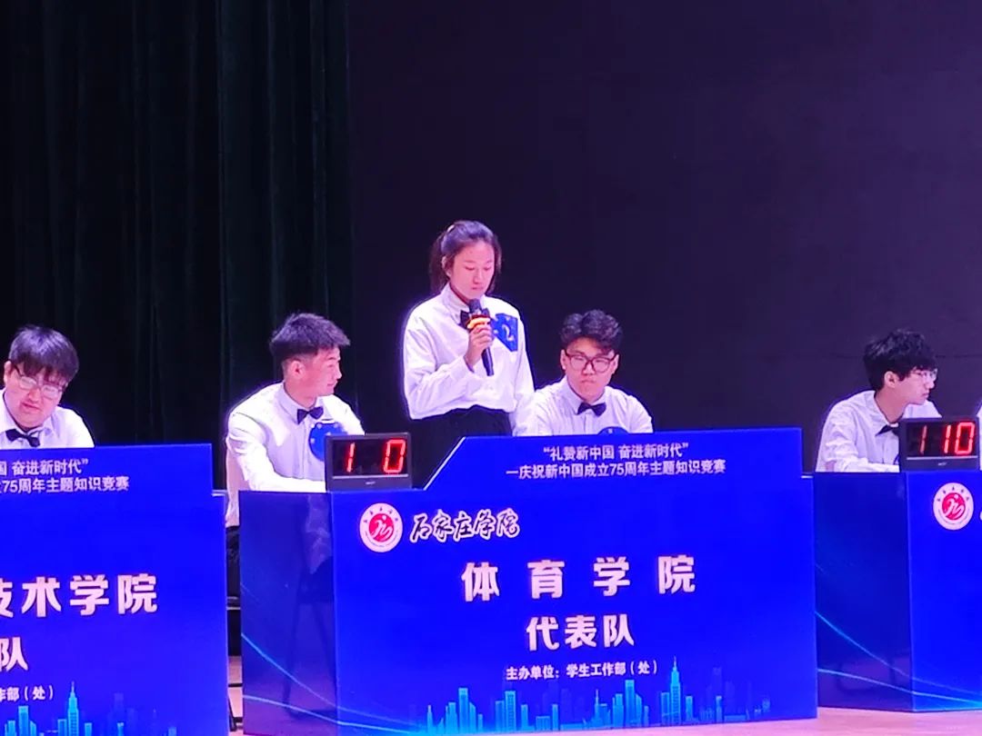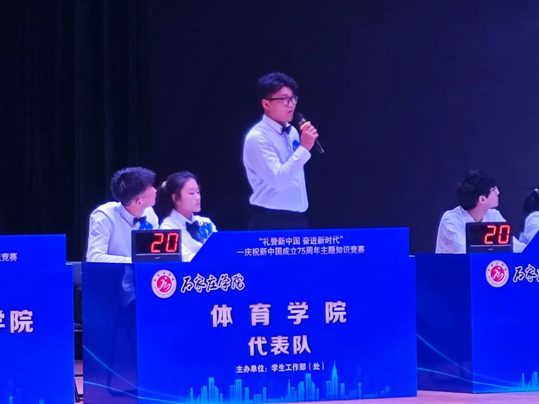2024 年 9 月27日2点30分我院3名学子在石家庄学院南校区尚文礼堂参加新中国成立 75 周年主题知识竞赛,他们分别为22级体育教育1班石硕然、22级体育教育3班郑炜钢、22级体育教育3班姚天通。此次知识竞赛决赛为现场答题,共分为三轮,分别为轮答、抽答、抢答,题目类型为单项选择题和不定项选择题三个环节。题目内容广泛,涵盖了国家政治、社会经济、历史文化及科技发展等多个领域。竞赛现场气氛热烈,我院青年学子们凭借深厚的知识储备和出色的临场发挥,赢得了在场师生的高度赞誉,特别是在抢答题环节,我院青年学子们都铆足力气,奋力抢夺答题权,斗智斗勇、奋勇争先,将比赛推向了最高潮,充分体现了我院青年学子敢为人先、比学赶超的精神风貌。