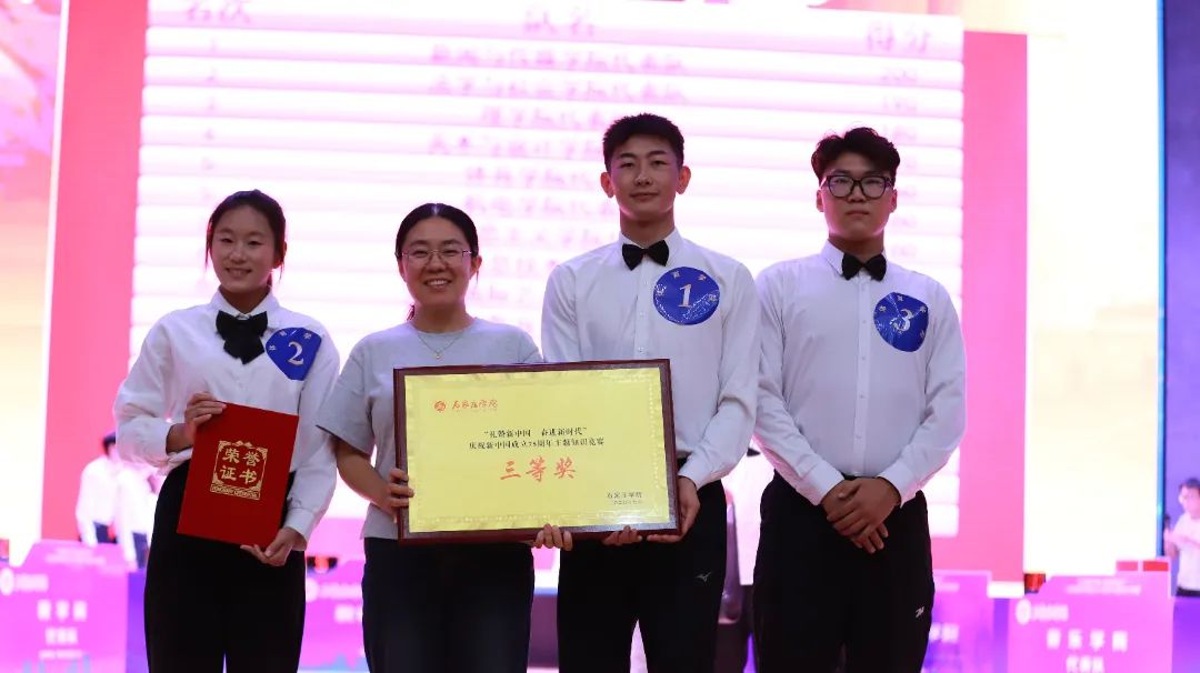 在“礼赞新中国 奋进新时代”庆祝中华人民共和国成立75周年主题知识竞赛决赛中,我院代表队经过激烈角逐,最终荣获三等奖!在此,我们向体育学院代表队的全体成员表示热烈的祝贺!他们不仅展示了扎实的知识储备与出色的应变能力,更体现了我院昂扬的精神风貌与团队合作的力量。