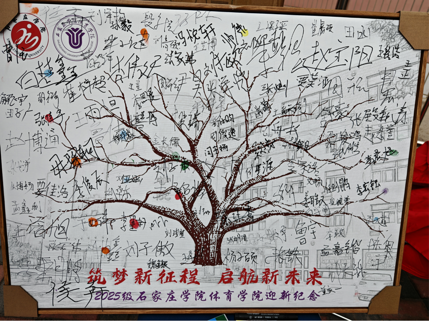体育学院迎新活动为营造有爱氛围;“成长树”新生签名,寄托梦想;由全体新生姓名创意呈现“我爱体院”图形,突出归属感与凝聚力,深刻诠释2025迎新主题:“‘体’韵新章,‘育’见未来”!