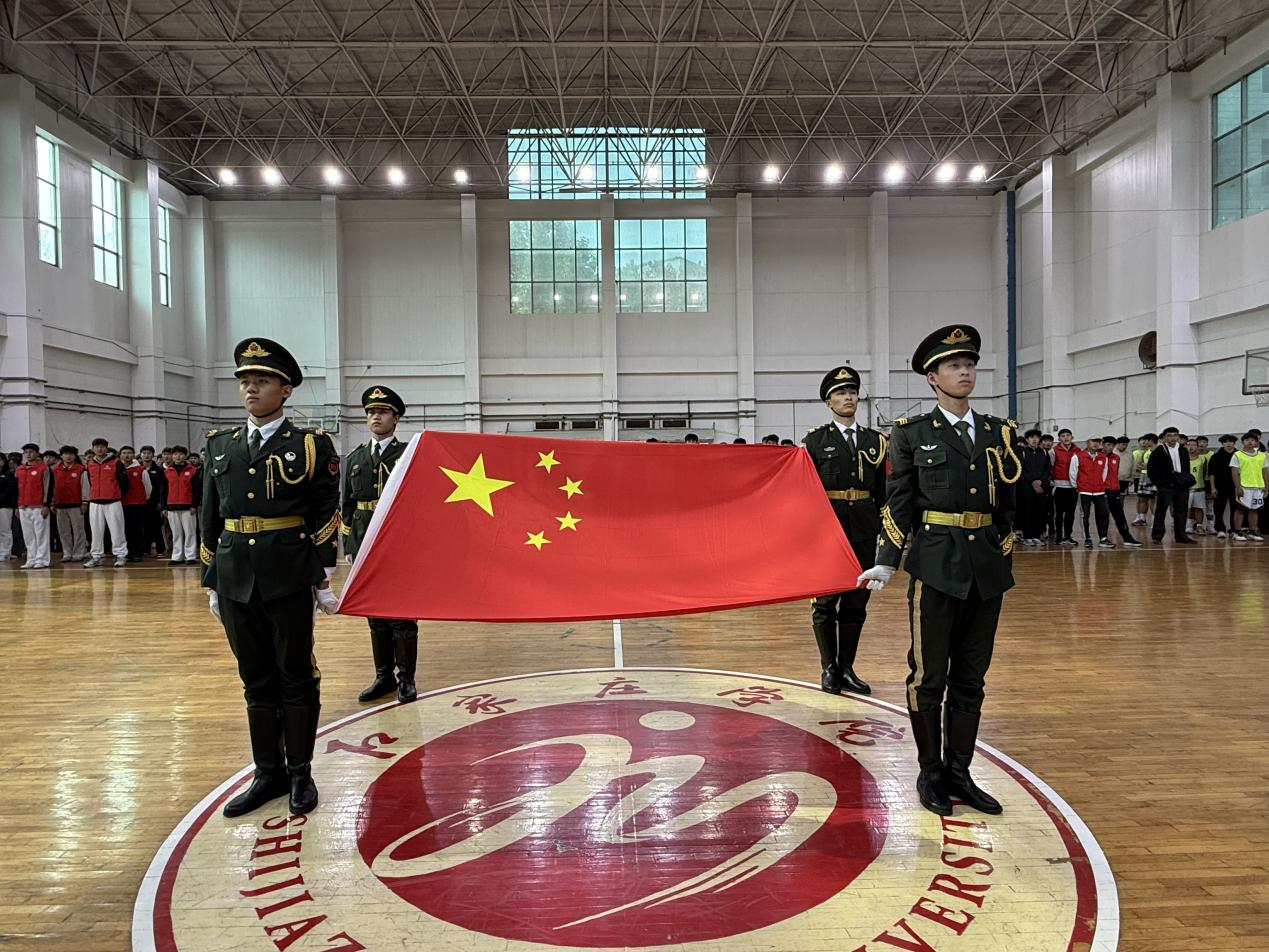 开幕式在庄严的升旗仪式中拉开帷幕。学校国旗护卫队队员们精神抖擞,迈着整齐的步伐护送国旗入场,在场师生全体肃立,爱国情怀与青春朝气在这一刻交融。随后,体育学院党总支书记席建涛发表开幕致辞,他指出,文化活动月是学校校园文化建设的重要载体,既为学生提供了展现运动风采的竞技平台,也为其搭建了交流舞台。他鼓励同学们以赛事为契机,在篮球竞技中锤炼团队协作与拼搏精神,在文化活动中绽放创意与才华,以青春之我共赴荣耀征程。