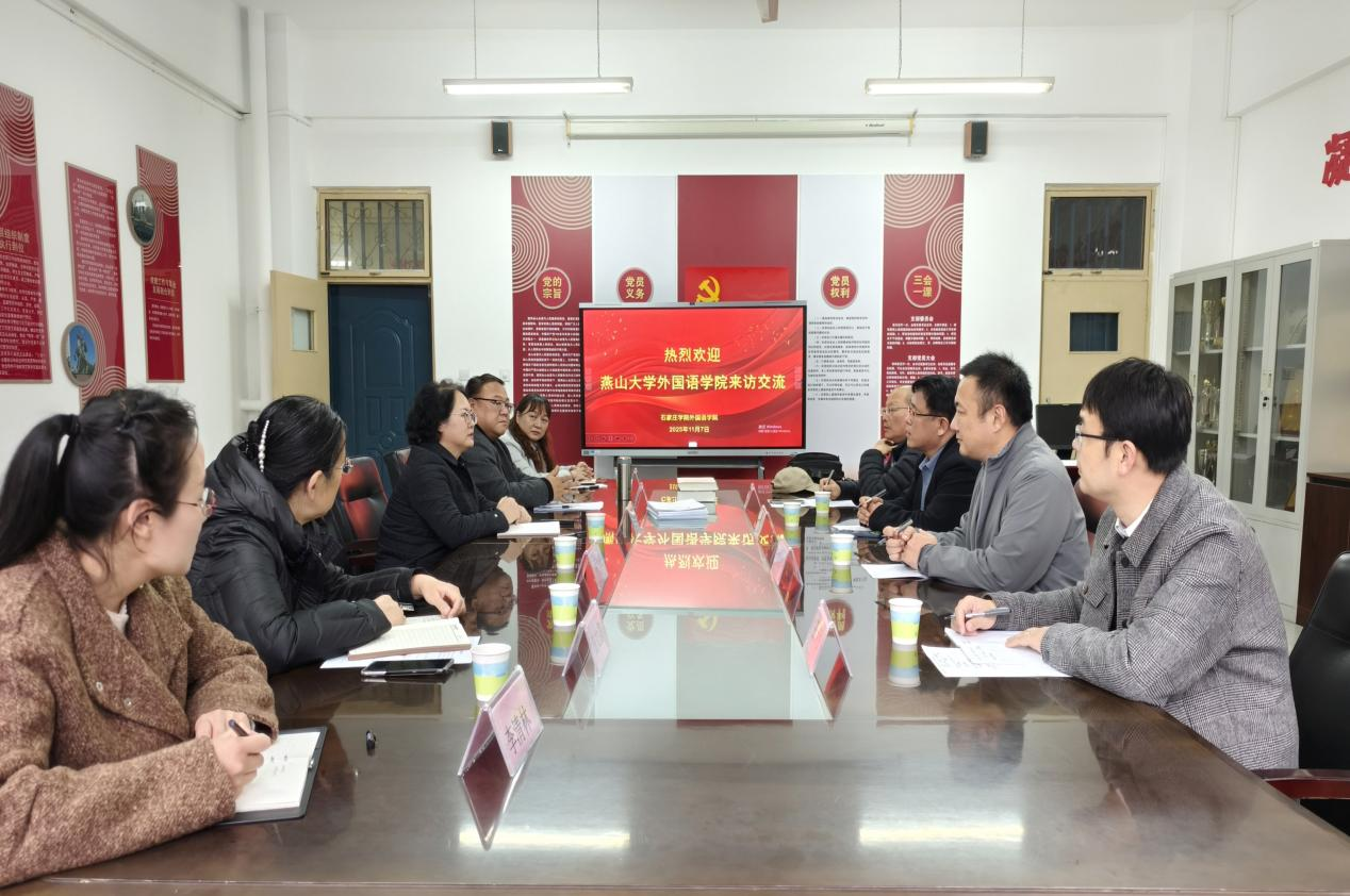 外国语学院副院长贺宇涛详细介绍了近年来在专业建设、师范专业认证、教学质量提升、科研发展、毕业生就业等方面的做法,并介绍了2025版人才培养方案的修订理念和具体变化。燕山大学外国语学院副院长赵志刚介绍了专业设置、师资队伍、科研和教学等方面的发展情况和成果。双方就师范专业建设和认证成果、教学和科研方面的具体做法进行了深入研讨。燕山大学外国语学院一行表示此次交流活动为燕山大学外国语学院的专业建设提供了参考借鉴,接下来将进一步加强交流,互相学习、共同探讨。