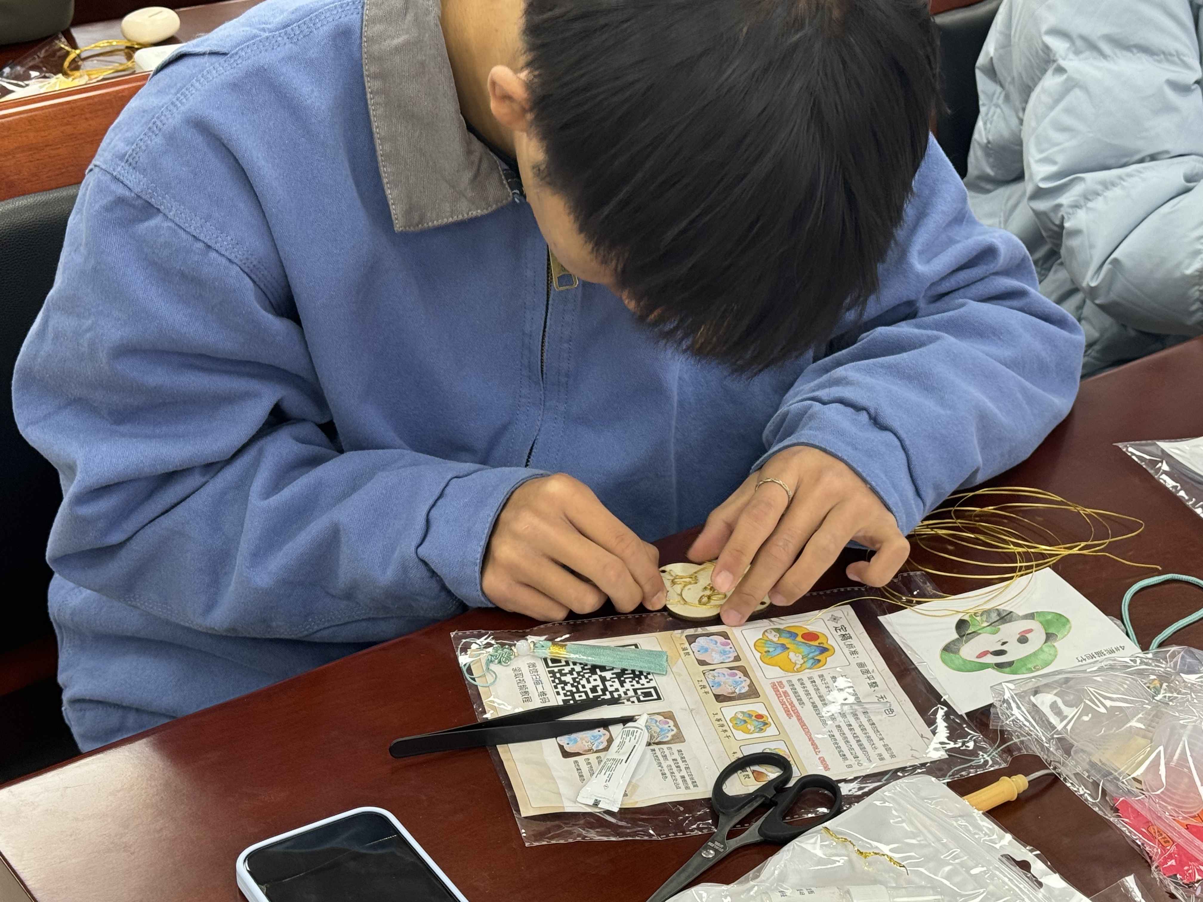 活动分为讲解、创作与分享三个环节。主持人首先介绍了掐丝珐琅的历史与工艺,并说明操作规范。在制作过程中,同学们逐步完成描稿、粘丝、填釉等步骤,亲手体验传统技艺的魅力。专注而放松的手工实践,有效帮助同学们舒缓压力、提升耐心,在创作中获得成就感与心灵滋养。