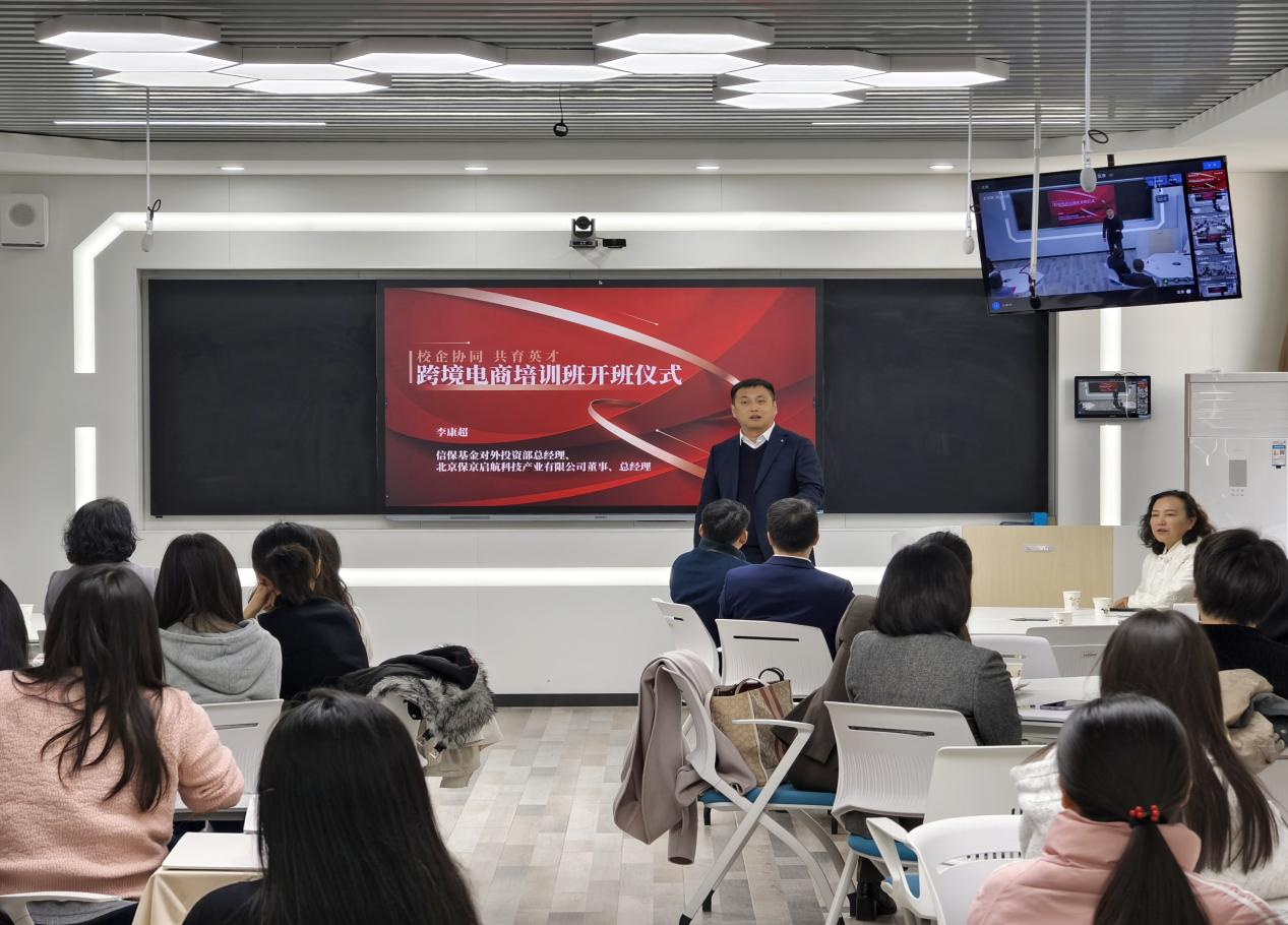 北京保京启航科技产业有限公司总经理李康超致辞,希望学员们抓住机遇,在企业导师的精心指导下,掌握跨境电商实操技能,诚恳欢迎首批学员毕业后加入该公司,助力“一带一路”跨境电商产业发展。