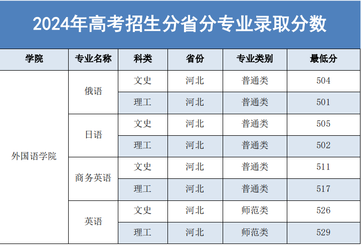 学院现设有英语(师范类)、商务英语、日语、俄语4个本科专业,在校本科生1100余人。英语专业2023年通过省级一流专业验收、并于2024年完成教育部师范类专业认证专家进校考察,商务英语专业成为我校首批应用型转型试点专业之一,两个专业在上海软科2024年专业排名中再次双双上榜,位列B级及以上。2024年日语专业开设了赴日带薪海外实习项目,组织了2批共28名学生赴日体验温泉酒店或滑雪场的服务工作,帮助学生开拓了国际视野,提升了跨文化交际能力。学院坚持以人为本,追求学生、教师、学院“三位一体”和谐发展的办学思路,坚持“学生中心,产出导向,持续改进”的教育理念,聚焦一流课程建设,扎实推进教学改革,教育教学质量稳步提升。始终注重学生知识体系的构建和综合素养的全面提升,在河北省高校外语教学大赛、“外研社·国才杯”“理解当代中国”全国大学生外语能力大赛、河北省互联网+大学生创新创业大赛、“高教社杯”大学生“用外语讲好中国故事”优秀短视频作品全国征集与交流活动、全国大学生英语竞赛、POCIB全国外贸从业能力大赛中均取得优异成绩。