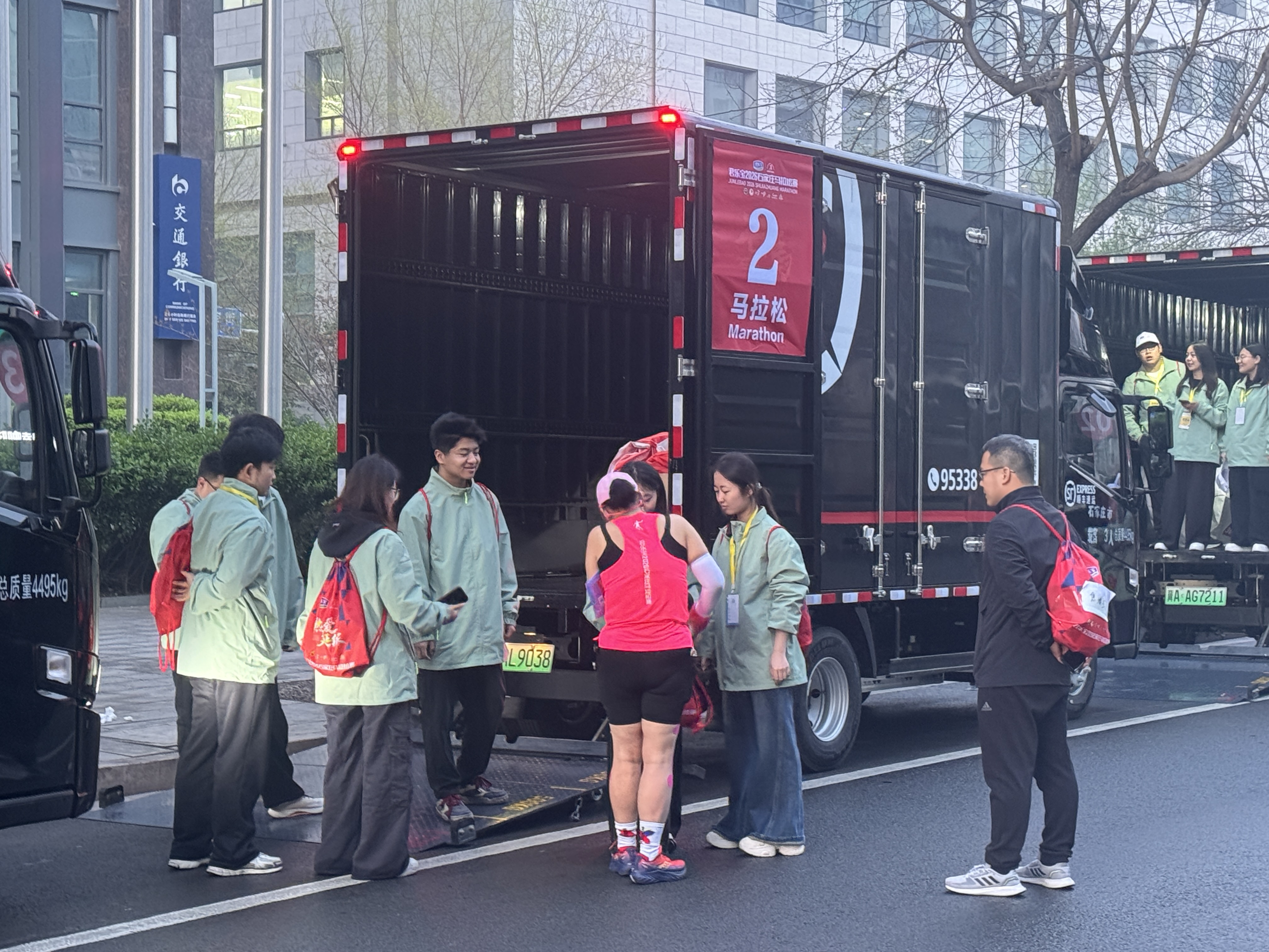 当日凌晨4点半,志愿者们集结完毕奔赴各服务点位,5点全员到岗。在存取衣现场,志愿者们通力协作、快速响应,认真核对参赛者信息,高效分拣存衣袋,态度亲切,动作娴熟,将每一份存衣袋准确无误的安全存放、完好归还。