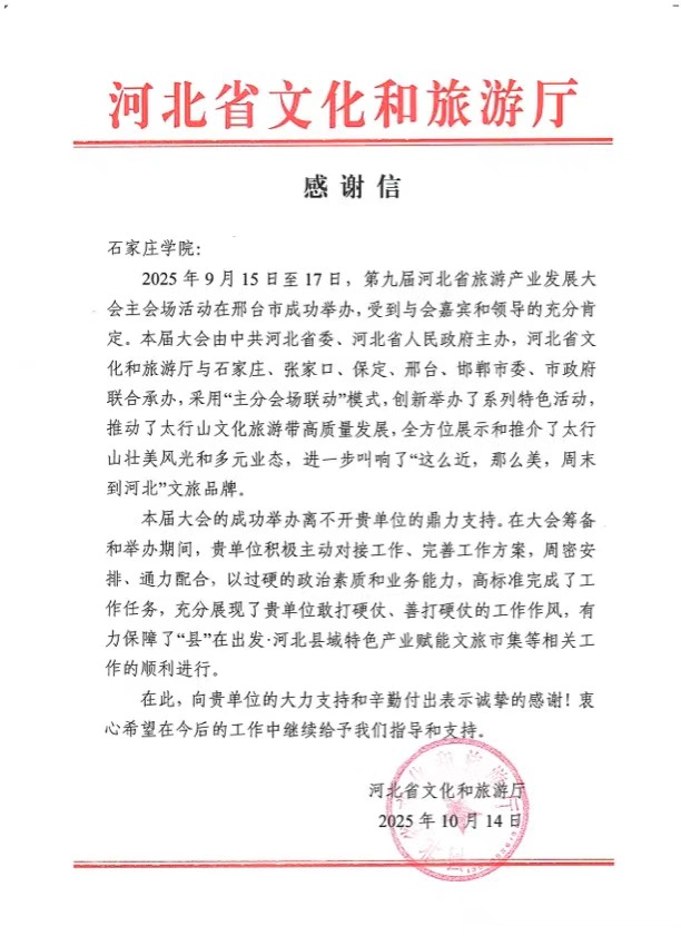 近日,我校收到河北省文化和旅游厅发来的感谢信,对我校新闻与传媒学院师生在第九届河北省旅游产业发展大会中的积极参与与突出贡献给予高度肯定。