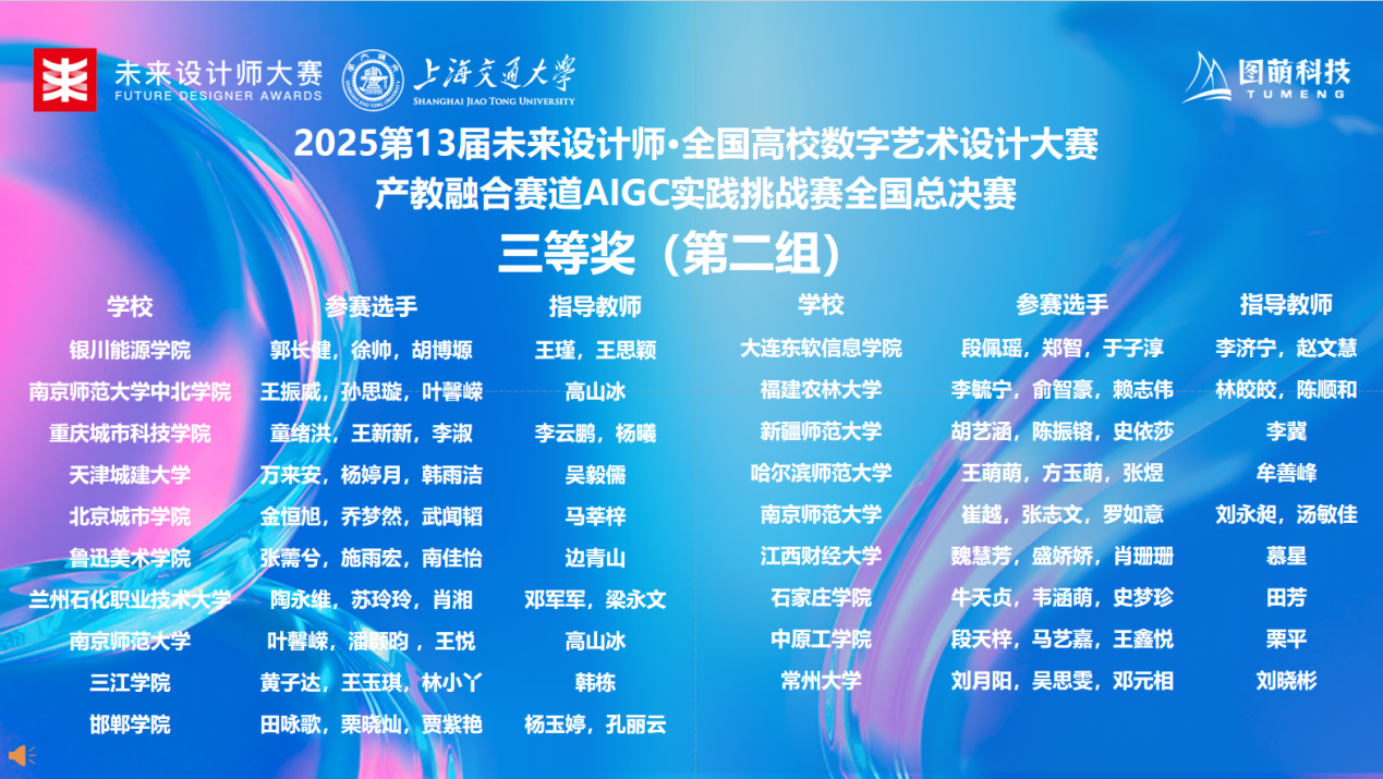 近日,第十三届未来设计师·全国高校数字艺术设计大赛(NCDA)AIGC赛道全国总决赛在上海交通大学圆满落幕。来自我校新闻与传媒学院的代表队凭借扎实的专业素养和突出的综合实力脱颖而出,荣获国家级三等奖。