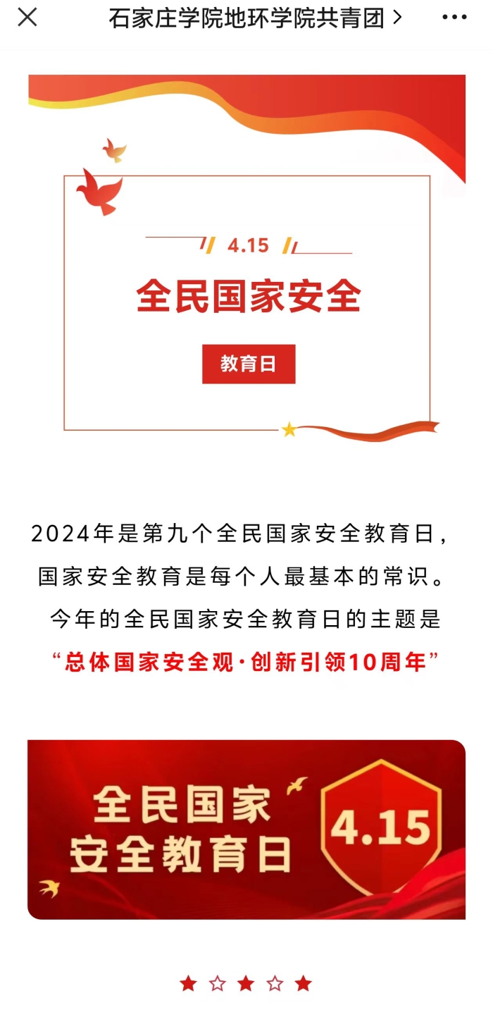 我院围绕习近平总书记关于全面加强国家安全教育的重要指示精神,积极响应“总体国家安全观·创新引领10周年”全民国家教育日宣传教育主题。于3月8日-15日,成功举办了“4·15”国家安全教育日宣传教育系列活动。有效激发了全院师生对国家安全教育知识的学习热情,营造出浓厚的国家安全教育氛围。