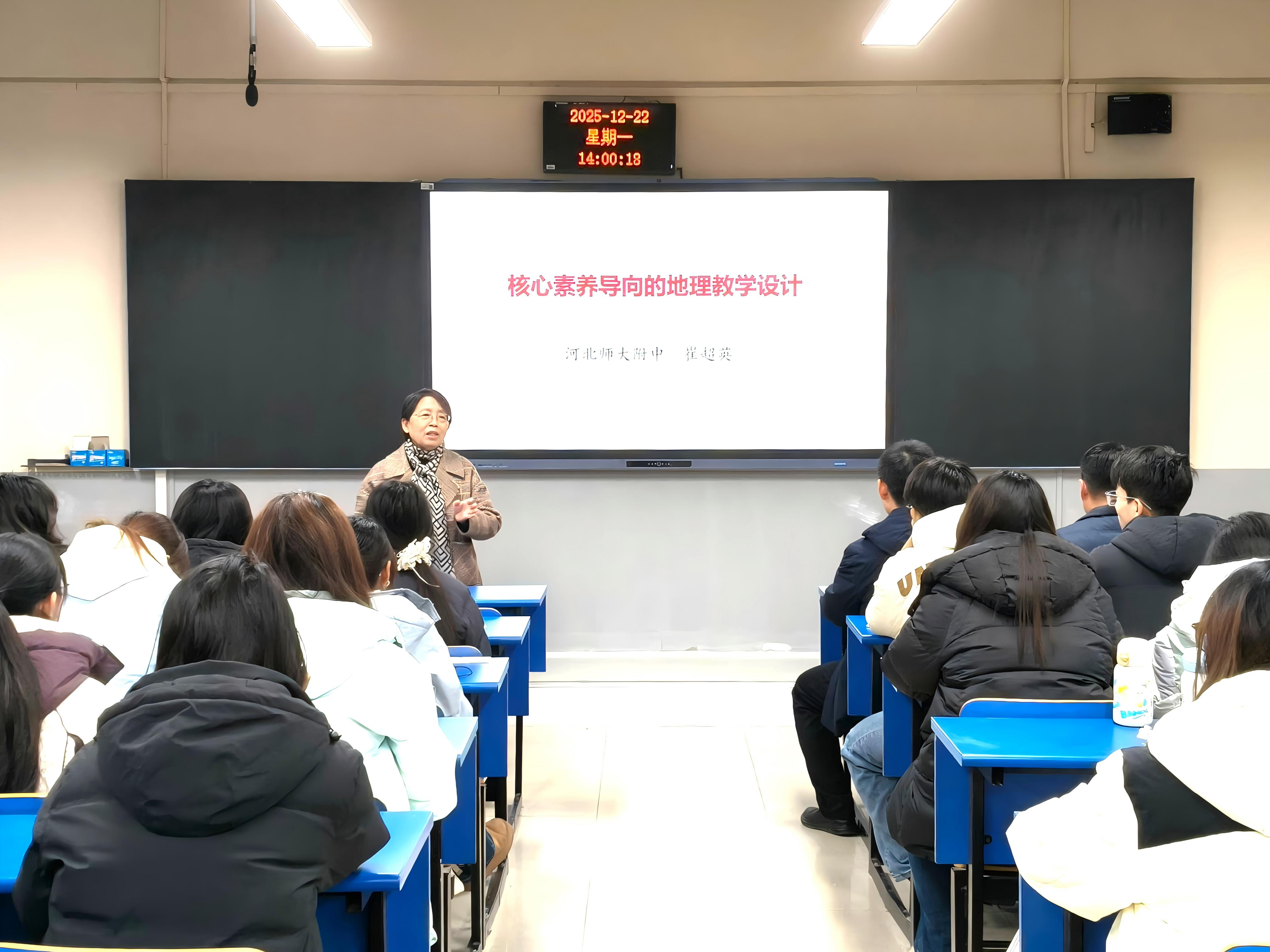 为进一步夯实地理科学专业学生教学实践能力,明晰核心素养导向下的地理教学逻辑,12月22日,我院邀请全国优秀地理教师、河北省特级教师崔超英,为2023级地理科学专业即将参加教育实习的学子作题为《核心素养导向的地理教学设计》的专题学术讲座。